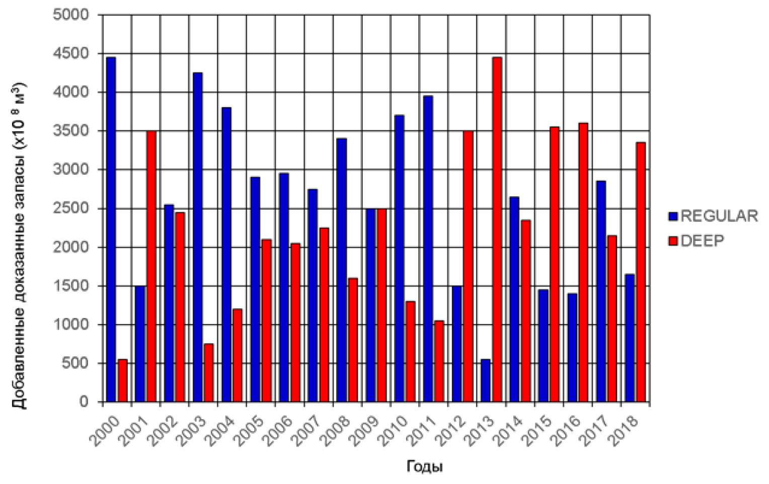 Рисунок 1. Распределение новых доказанных геологических запасов по категориям глубин: обычные и неглубокие разрезы, глубокие и сверхглубокие