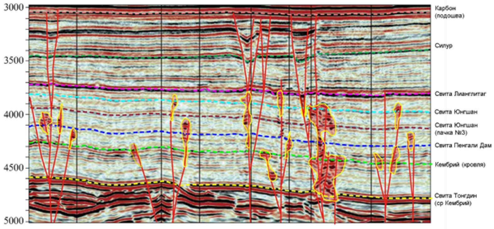 Тарим | Кембрий – Ордовик | Палеоподьем Табей Палеоподьем Хетиан Древняя структура Тадонг Подьем Тажонг-Бачу Гу Склон Макати | 5000–8000 5000–6500 5000–7500 5000–7500 7000–7500 | 2,1 2,6 3,0 2,8 0,5 | 0,8 0,8 1,0 1,8 0,5 | |