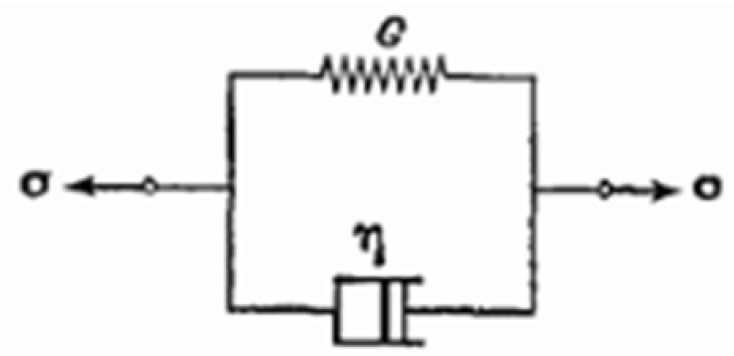 Первые модели для вязкоупругого материала были предложены Д.Т. Максвеллом (рис. 1) и Т.У. Кельвином (рис. 2) [8]. Модель Максвелла представляет собой последовательно соединённые пружину и демпфер, причем в данной модели напряжение одинаково в каждом элементе, а общая деформация равна сумме деформаций демпфера и пружины.