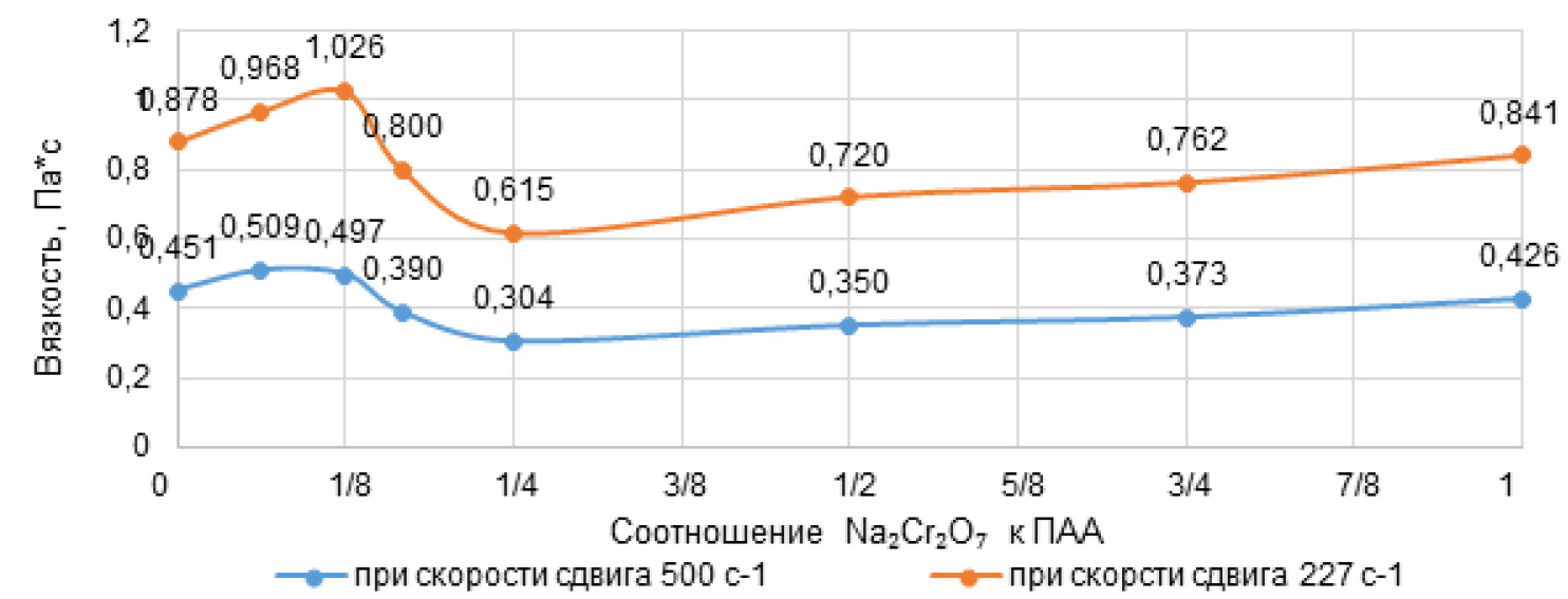 - Повышение концентрации катиона хрома увеличивает вязкость системы за счет роста сил электростатического отталкивания и развёртывает в цепи полимерную сетчатую структуру. Максимальная вязкость ВУС наблюдается при соотношении концентрации бихромата натрия и ПАА (Flodrill PAM 1040) 1/16–/1/8.