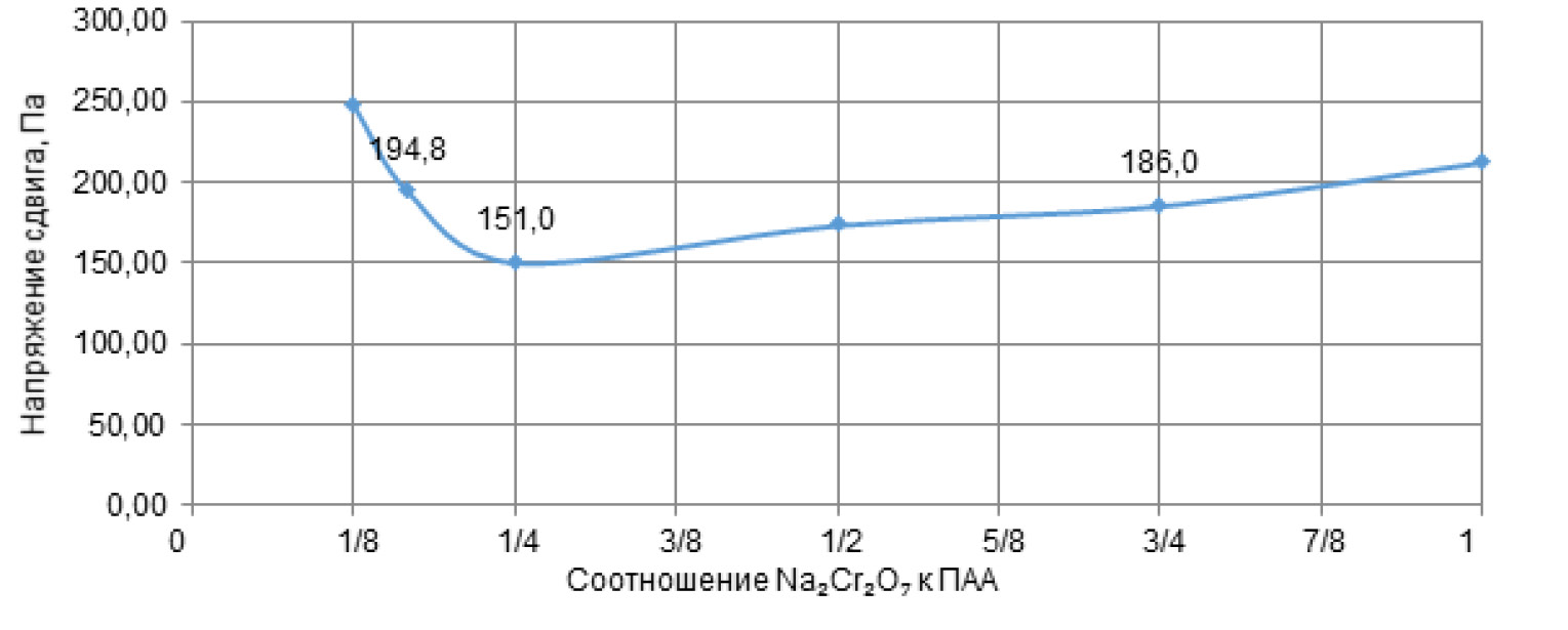 Поскольку степень очистки ствола скважины и вытеснение бурового раствора зависят от соотношения вязкостей контактирующих жидкостей, по результатам испытаний оптимальным соотношением концентрации бихромата натрия и ПАА (Flodrill PAM 1040) является диапазон 1/16–1/8.