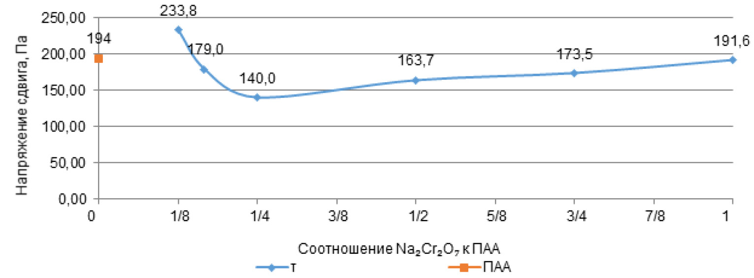 Рисунок 7. Влияние Na2Cr2O7 на напряжения буферной жидкости в затрубном пространстве при τ = 227 с-1