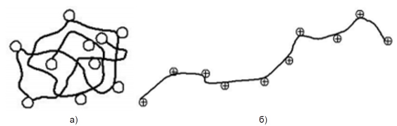 Рисунок 9. Структура макромолекул полиэлектролита в неионизованном (а) и ионизованном (б) состоянии
