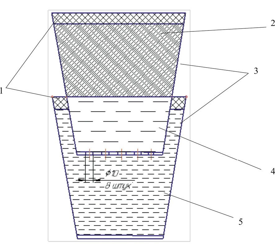 Рисунок 10. Схема прибора для оценки удерживающей способности буферной жидкости. 1 – резиновые прокладки; 2 – цементный раствор; 3 – стаканы; 4 – буферная жидкость; 5 – техническая вода