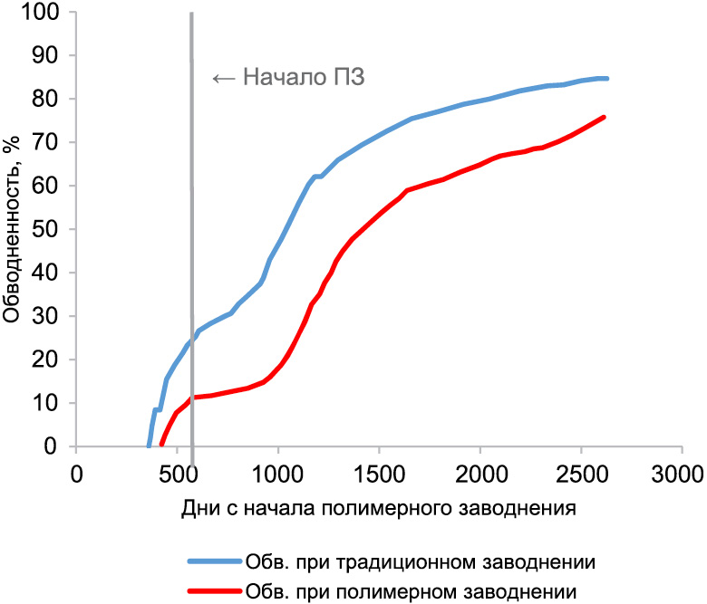 В отношении м. Dalia будет целесообразным рассмотреть общие положения на момент пилотного испытания (табл. 3). Стоит учитывать, что ПЗ рассматривался как метод разработки на ранней стадии. Закачка полимера началась в 2009 г., тогда как первая нефть была отобрана в 2006 г. [28]. Однако на месторождении были такие осложнения, как высокая минерализация воды (>25 г/л) и большое межскважинное расстояние. Исходя из этих факторов, методом разработки месторождения была выбрана закачка маловязкого (3 сП) полимерного раствора вместо ТЗ водой. С помощью модели на базе отборов скважин были сопоставлены 2 сценария обводненности: при традиционном и полимерном заводнениях (рис. 1). На графике видно, что рост обводненности при ПЗ происходит со значительно более низким наклоном, чем при ТЗ, что увеличивает добычу нефти и положительно влияет на КИН.