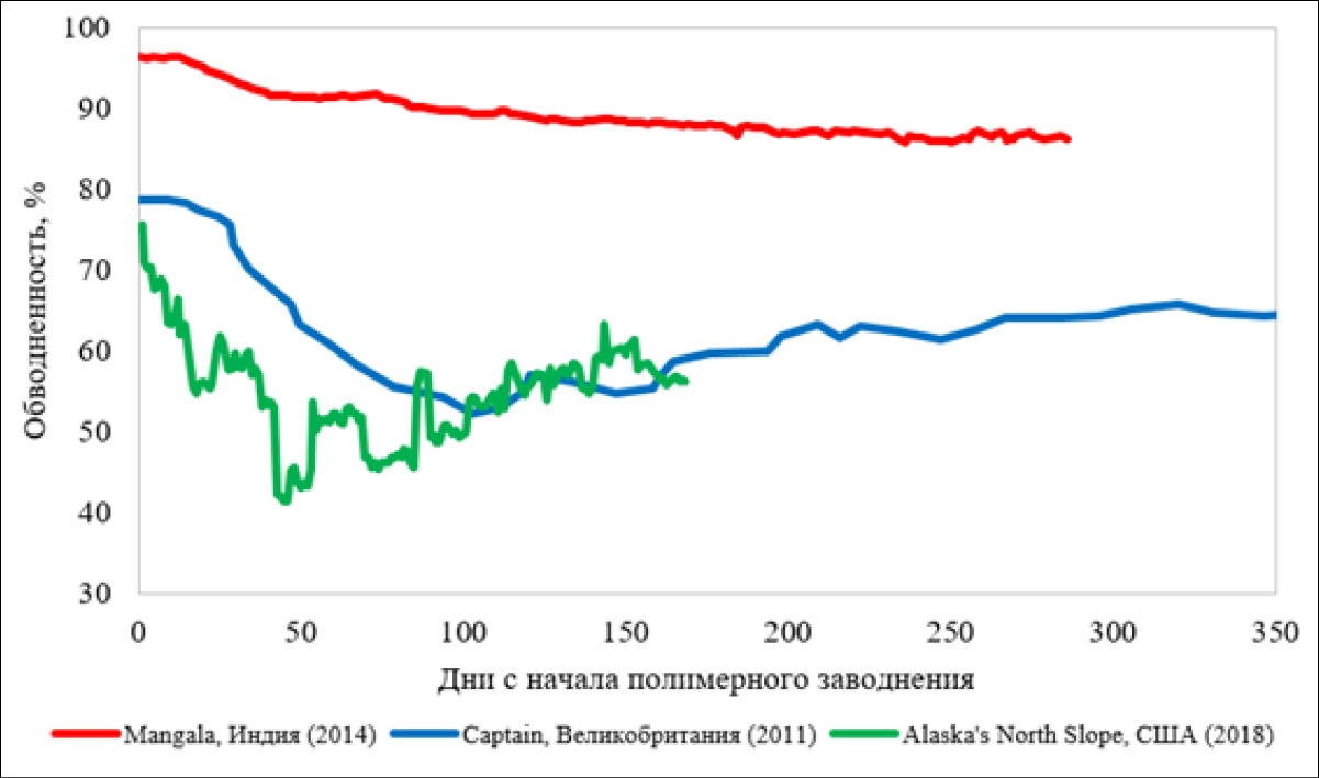 Рисунок 2. Динамика обводненности с начала применения ПЗ (Mangala, Captain, Alaska)
