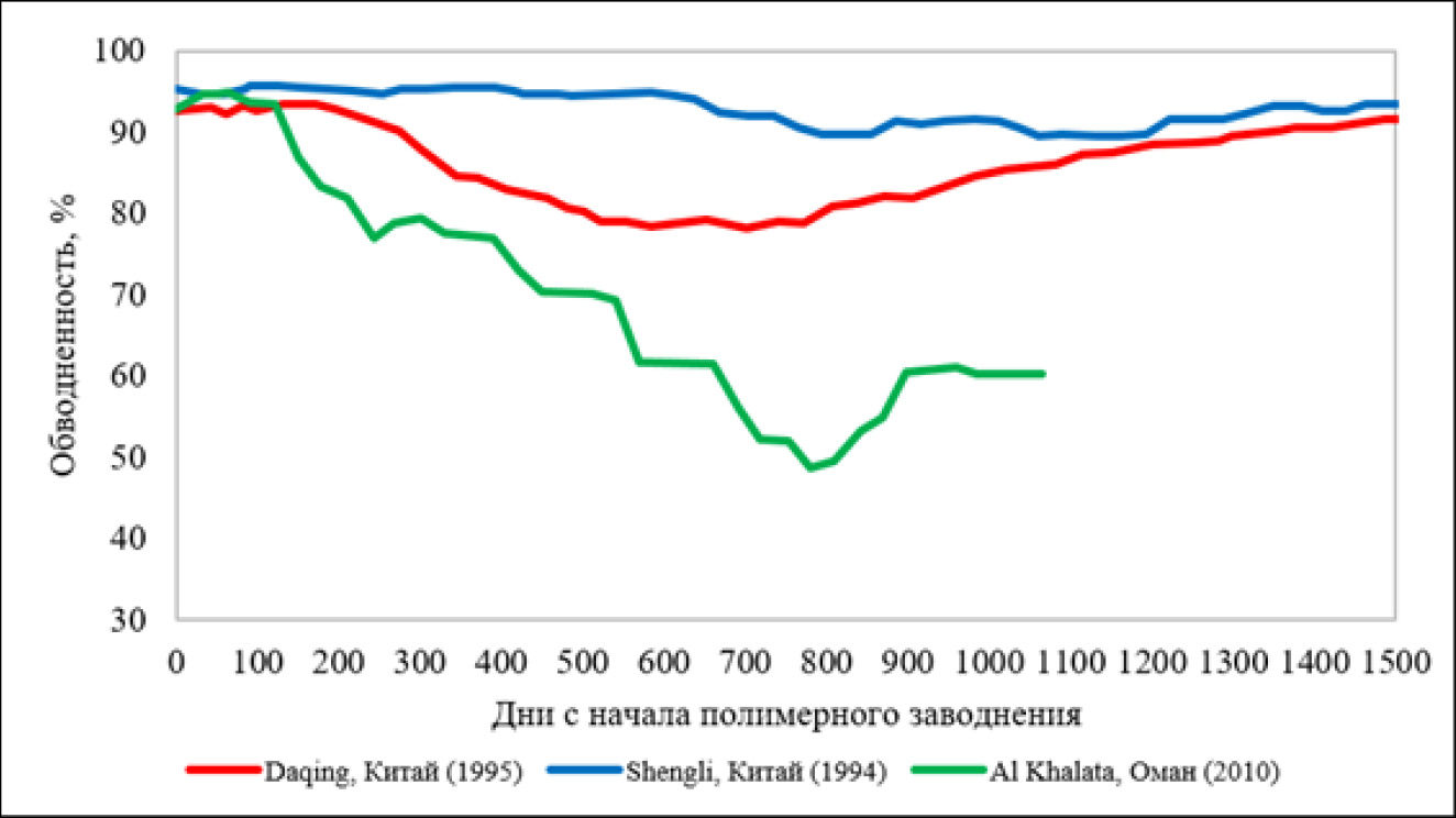 Рисунок 3. Динамика обводненности с начала применения ПЗ (Daqing, Shengli, Al Khalata)