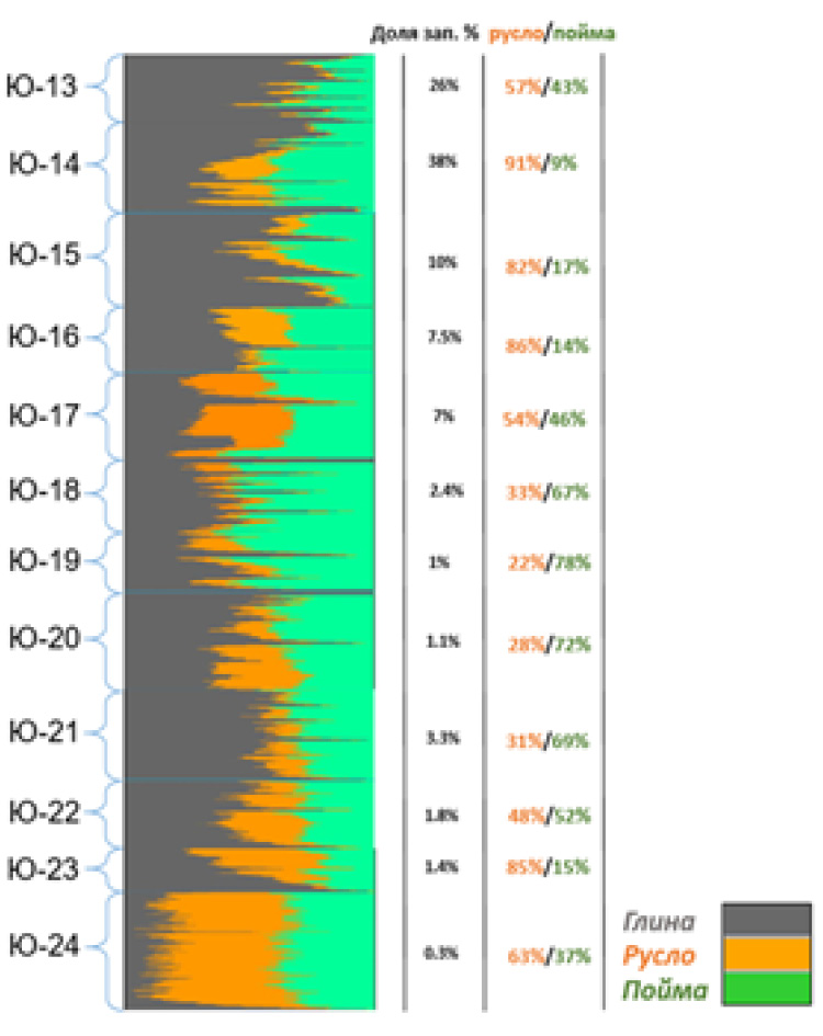 В соответствии с представленной на рис. 6 последовательности скважин был построен геологический профиль, показанный на рис. 7. По данному разрезу можно заметить, что преобладают русловые и пойменные отложения, в отличие от глин. Этот факт подтверждает хорошую однородность, наблюдаемую из рис. 5.