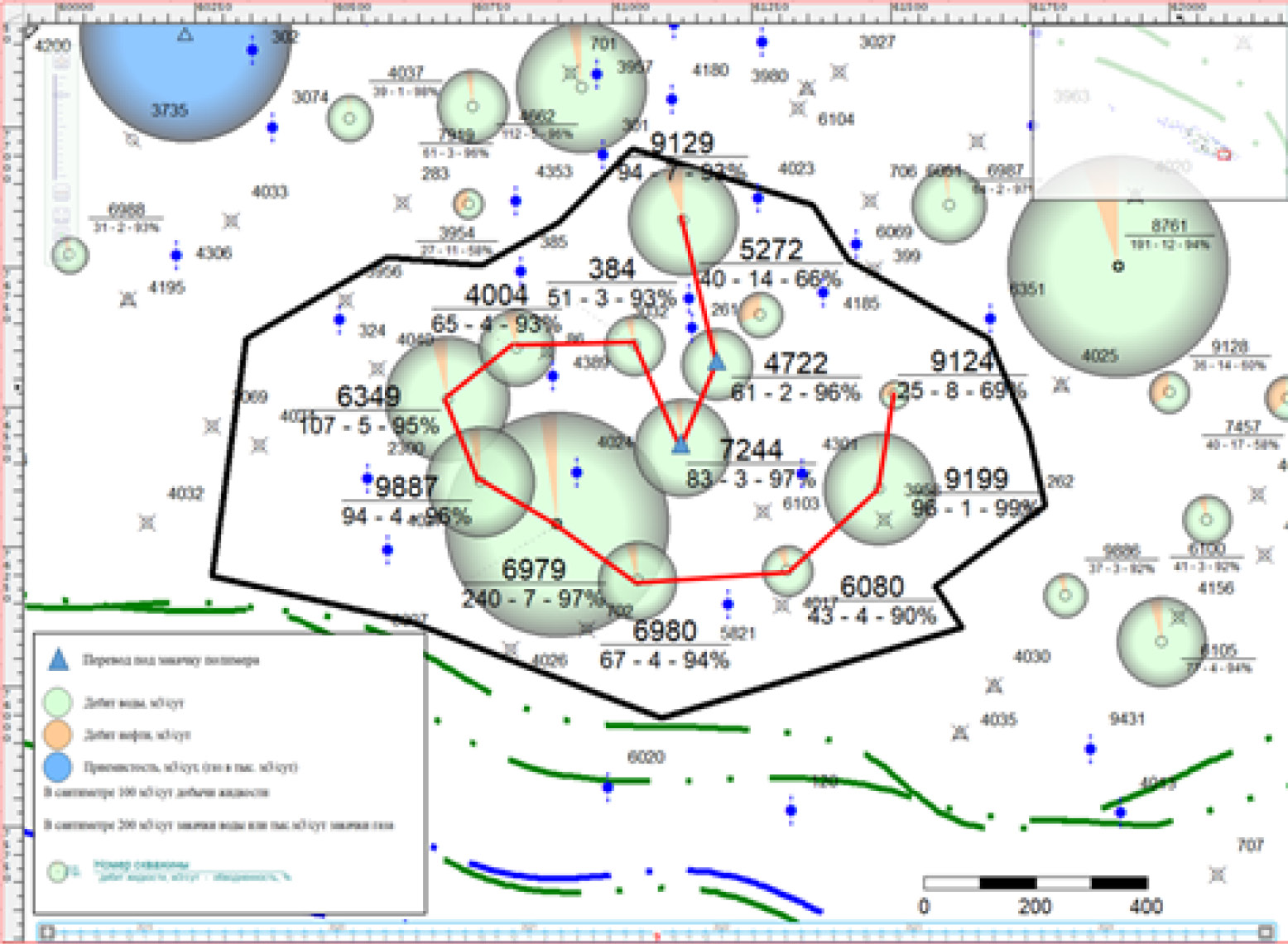 Площадь участка составляет 1,004 км² с начальными геологическими запасами 6243 тыс. т. Согласно графику разработки, накопленная добыча по участку составила 2339 тыс. т нефти. Выработка от извлекаемых запасов составила 69%, а текущая обводненность – 94,1%. Среднее межскважинное расстояние составляет 195 м. Две центральные добывающие скважины 4722 и 7244 предполагается перевести под нагнетание полимерного раствора. Итого по участку количество скважин составит 2 нагнетательные и 11 добывающих.