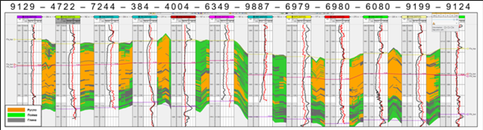 Рисунок 7. Геологический профиль по разрезу скв. 9129-9124 пилотного участка