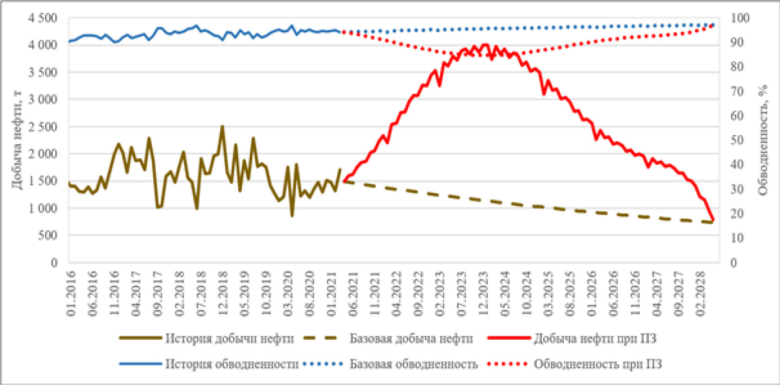 Прогноз добычи на пилотном участке ПЗ. Оценка эффективности ПЗ осуществлялась с помощью прогноза добычи, основанного на результатах пилотного испытания на м. Каламкас [51]. Авторы статьи подтвердили рентабельность применения ПЗ путем прогнозирования обводненности и КИН на участке.