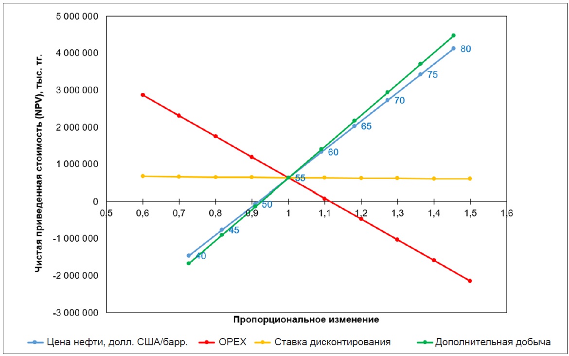 Чувствительность чистой приведенной стоимости к таким параметрам, как цена нефти, операционные затраты (OPEX), дополнительная добыча и ставка дисконтирования, представлена на рис. 9. По графику видно, что NPV наиболее чувствительна к дополнительной добыче и цене на нефть. Также NPV не менее чувствительна к операционным затратам. При увеличении цены на нефть всего на 10% окупаемость проекта значительно увеличивается и обеспечивается более уверенная рентабельность. Учитывая актуальную цену 80 долл. США/барр., индекс окупаемости (PI) будет равен 1,54, а NPV проекта составит 4125,05 млн тг. Тем временем изменение годовой ставки дисконтирования в таких же пропорциях является незначительным и не влияет на NPV.