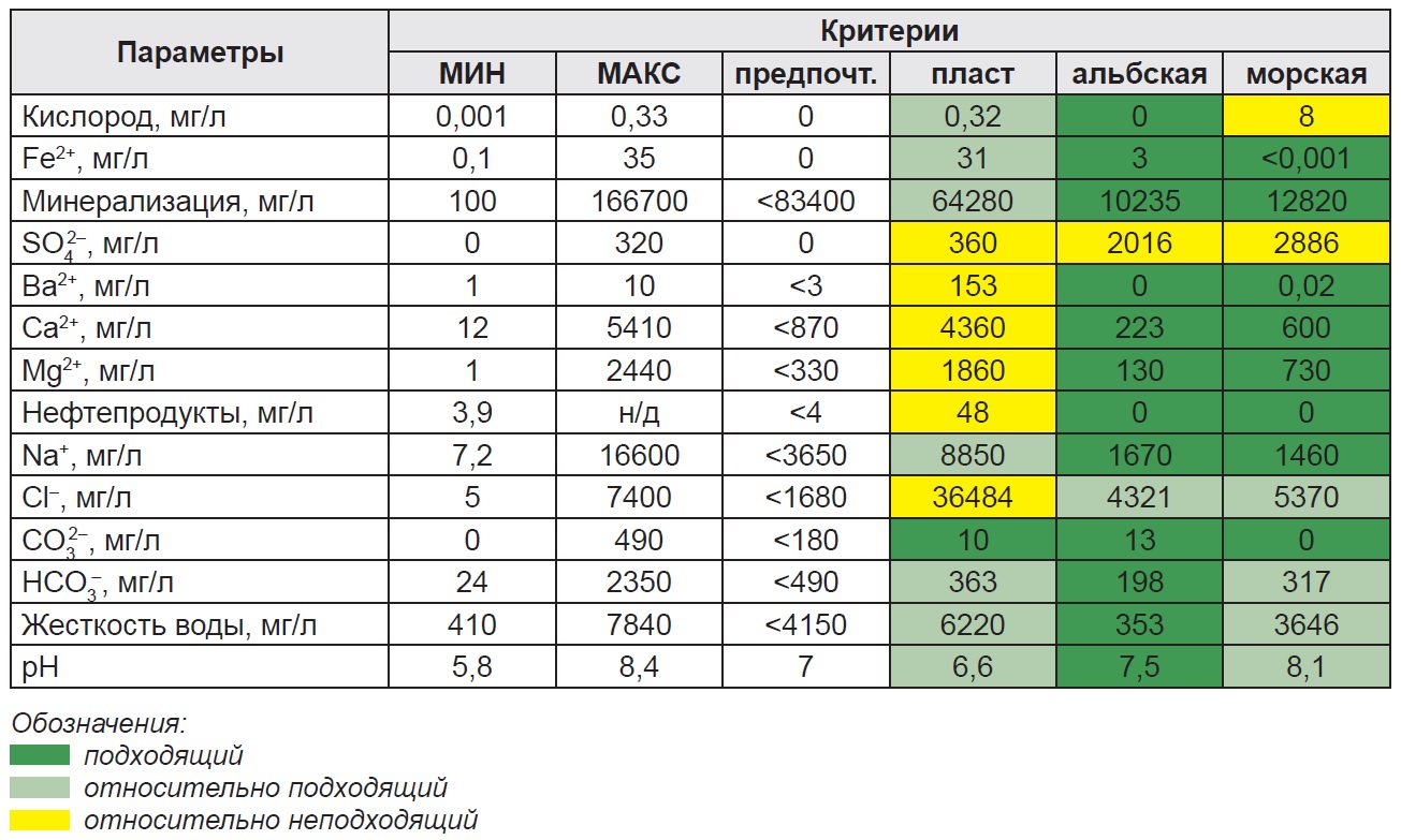 При анализе компонентного состава воды с м. Узень было выявлено большое количество сульфатов. В случае использования воды есть риск солеотложения. При очистке воды от сульфатов также велика вероятность растворения кислорода в воде. В используемой пластовой воде есть риск образования нерастворимого осадка в виде сульфата бария (BaSO4). Для использования пластовой воды необходимо проводить более глубокую очистку от нефтепродуктов и механических примесей. Морская вода характеризуется избыточным наличием кислорода, что потребует дополнительных капитальных и операционных затрат на подготовку. В аспекте химической деструкции полимера рекомендуется использовать альбскую воду ввиду отсутствия кислорода и низкой концентрации Fe²+. Концентрация Ca²+, Mg²+ также находятся в благоприятном диапазоне. Более того, анализ доступности водоснабжения альбской водой на месторождении показал, что присутствует возможность использования 19 тыс. м3/сут (7 млн м3/г.) с возможностью увеличения объема подачи до 47 тыс. м3/сут (17 млн м3/г.). В случае положительных результатов пилотного испытания, объем альбской воды будет достаточен и для более масштабного промышленного испытания.