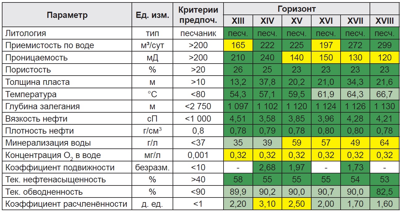 Толщина и пористость коллекторов в среднем составляют 10–11 м и 25–27% соответственно. Проницаемость пласта является одним из важных критериев для ПЗ, минимальное значение которой по изученным проектам составляет 100 мД и может увеличиваться до неограниченного максимального значения. Высокая проницаемость нефтяной зоны положительно влияет на возможность закачки полимерной оторочки и, соответственно, эффективность ПЗ. Однако в редких случаях наличие суперпроницаемых коллекторов приводит к прорыву или языкообразованию полимерного раствора и, соответственно, негативно влияет на эффективность процесса [16, 17].