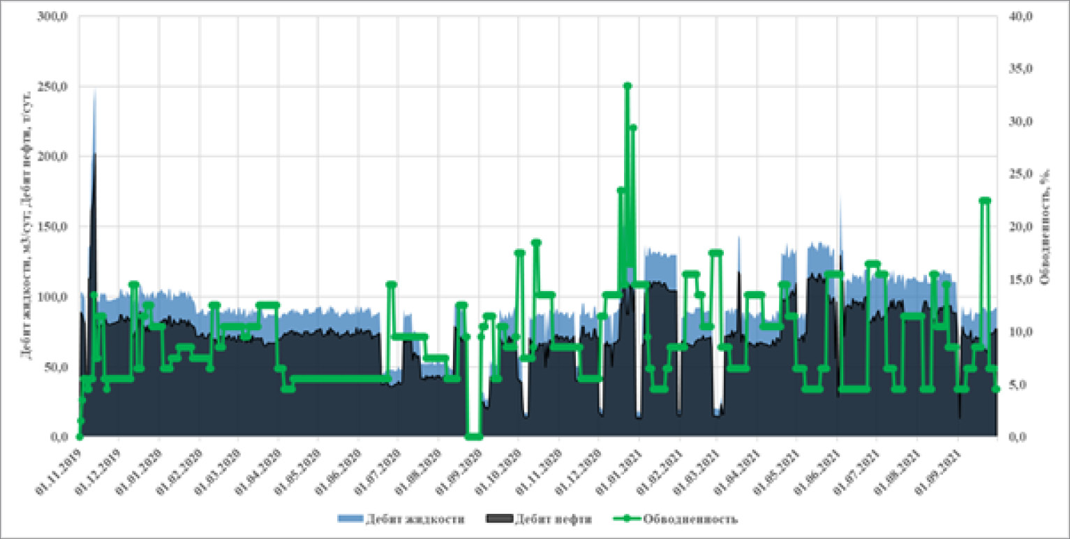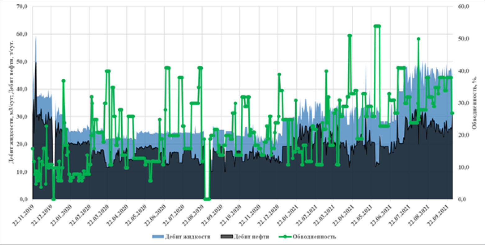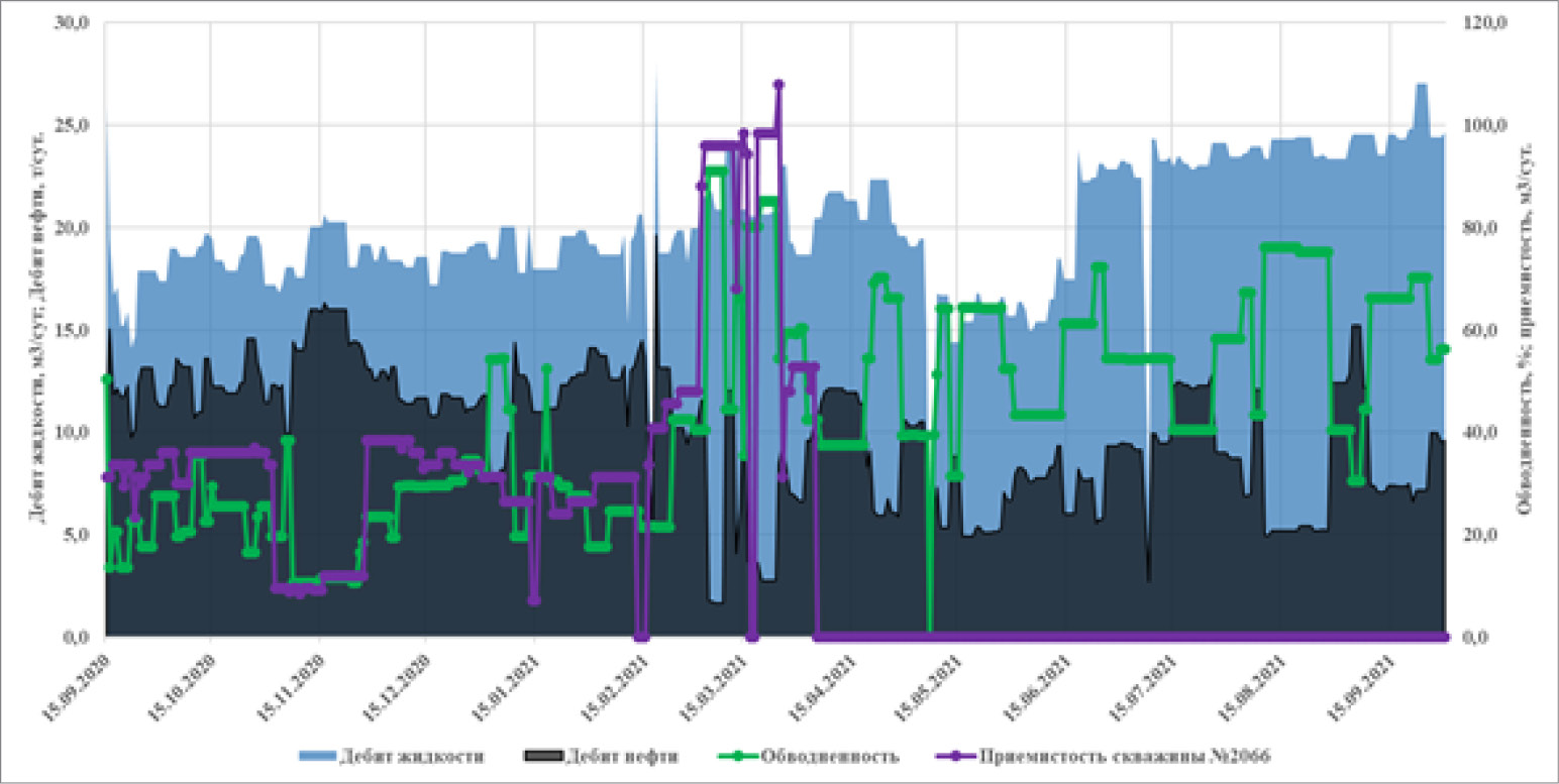 Скважина вступила в эксплуатацию в 2020 г. с дебитом нефти 11,5 т/сут при плановом дебите 10 т/сут. До февраля 2021 г. скважина работала с дебитом нефти более 10 т/сут. Далее наблюдается рост обводненности. Обводненность соседних вертикальных – выше 60%. К концу января 2021 г. обводненность выросла. Рост обводненности обусловлен с влиянием закачки нагнетательной скв. 2066. В январе была увеличена приемистость нагнетательной скв. 2066. После увеличения объема закачки также по соседним вертикальным скв. 2044 и 2064 наблюдается резкий рост обводненности. В связи с отрицательным влиянием, скважину в феврале отключили. Далее после отключения нагнетательной скв. 2066, обводненность постепенно снизилось во всех добывающих скважинах.