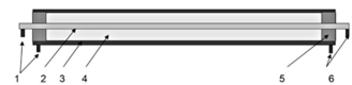 Рисунок 2. Схема испытательного стенда. 1 – контакты для подключения генератора сигналов, 2 – проволока; 3 – труба, 4 – среда, заполняющая трубу, 5 – диэлектрическая пробка, 6 – контакты подключения источника питания [7]