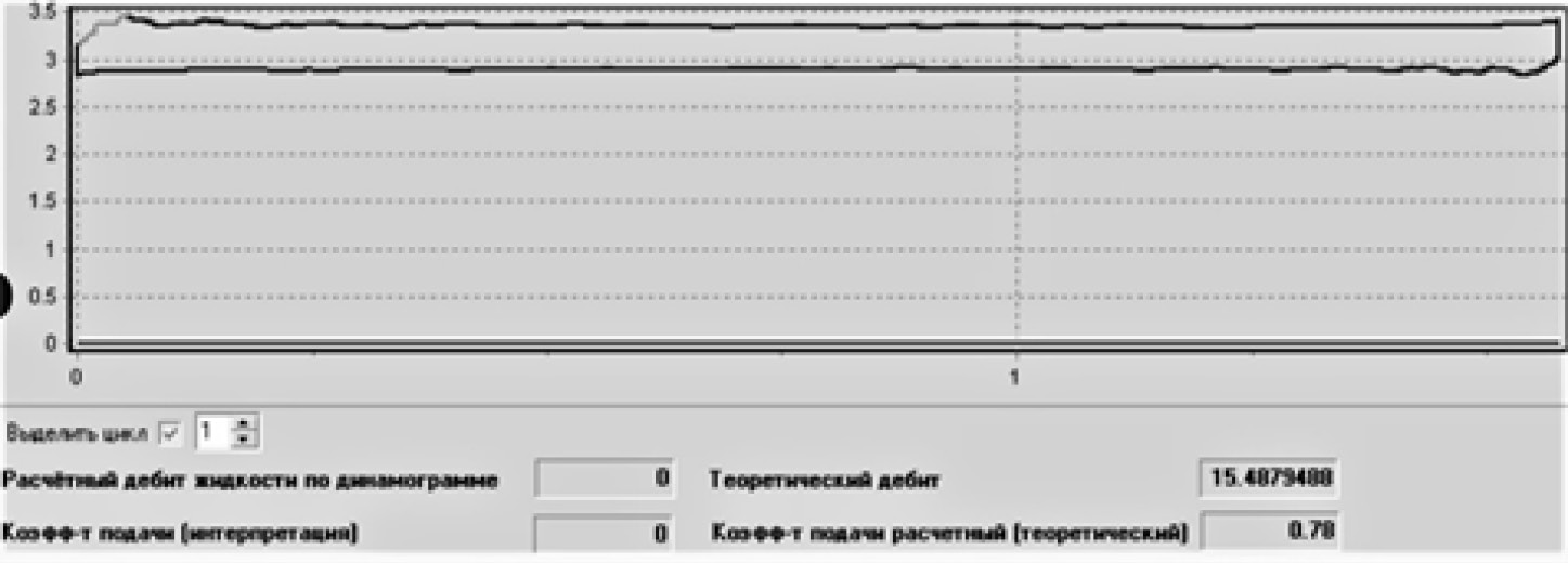Испытание 2. Скв. 4051. Данную скважину в феврале 2019 г. остановили из-за отсутствия подачи жидкости. По динамограмме (рис. 5) видно, что на скважине не работают оба клапана. В мае 2018 г. в скважине проводились ГРП, наработка составляла 212 сут. После промывки скважины работоспособности насоса не наблюдалось, поэтому принято решение о постановке бригады ТКРС.