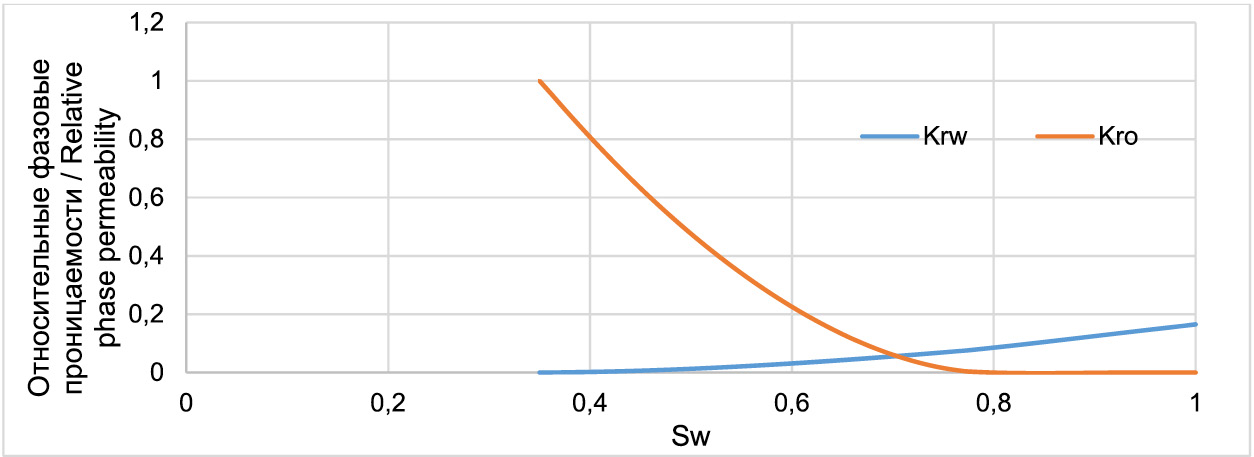 Изучаемое месторождение расположено на западе Казахстана. Разведочными скважинами были вскрыты 4 продуктивных нефтяных пласта, сложенных верхнепермскими породами, которые разрабатываются как один эксплуатационный объект. Породы преимущественно глинистые, среди которых выделяются песчаники и алевриты, служащие породами-коллекторами. Поскольку объект многопластовый, при разработке возникают проблемы с дренированием и выработкой слабопроницаемых пород. По кривым относительных фазовых проницаемостей (далее – ОФП) можно сделать вывод о склонности горной породы взаимодействовать с определенной жидкостью. Согласно кривым, точка равенства ОФП соответствует водонасыщенности Sw > 0,5, следовательно, вода является смачивающей фазой (рис. 2). Основные свойства нефти и коллектора перечислены в табл. 1.