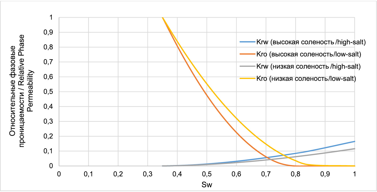 Моделирование малосольного заводнения было реализовано через трехфазный симулятор ECLIPSE 100. В данном симуляторе есть опция воды с низкой солёностью, которая активируется через ключевое слово «LOWSALT» в секции RUNSPEC. Она связывает общую солёность воды с кривыми относительной фазовой проницаемости. Для этого надо определить кривые ОФП для вод с высоким и низким содержанием солей. Для вод со значением солёности, находящимся между этими двумя кривыми, идет интерполяция через функцию LSALTFNC.