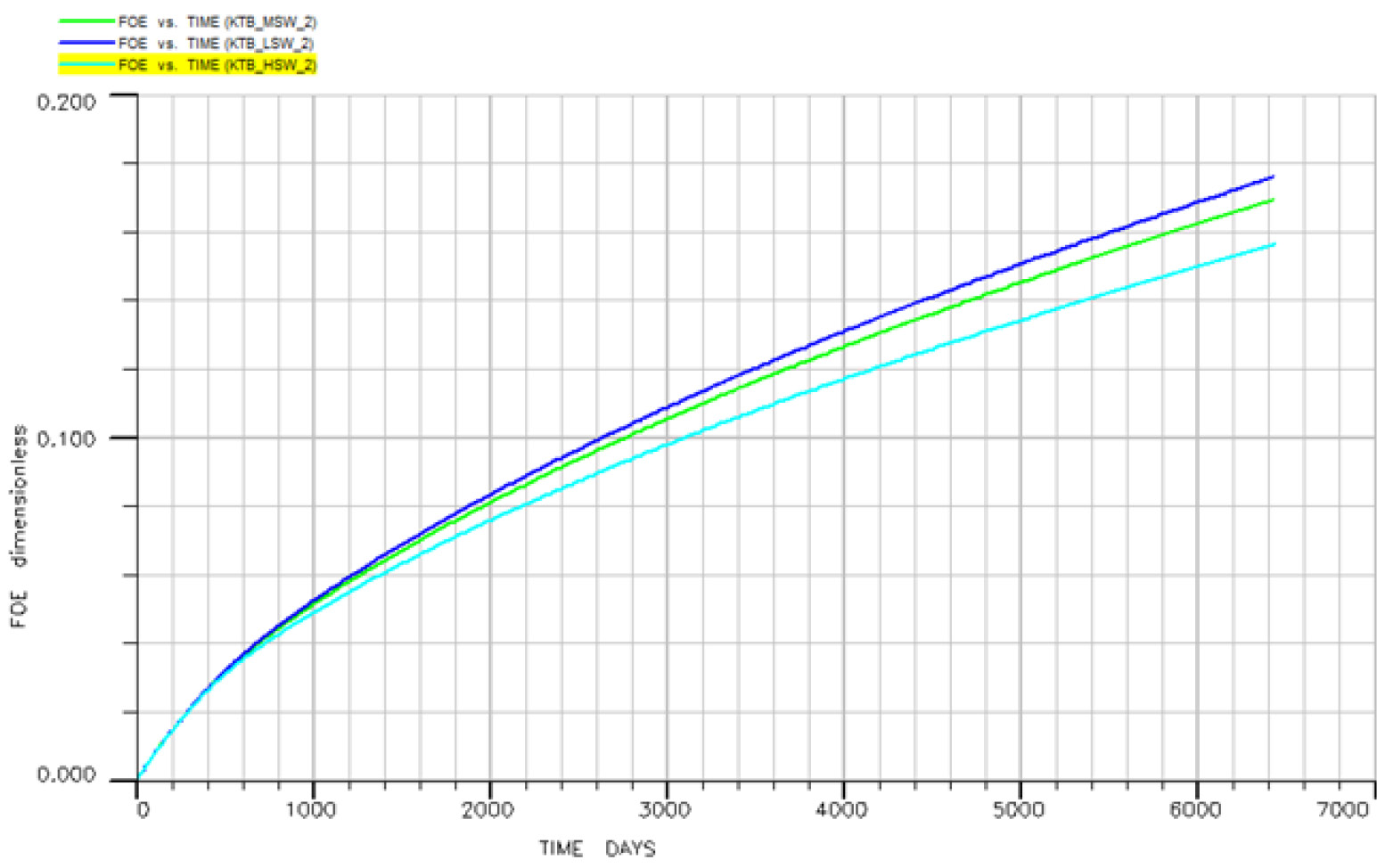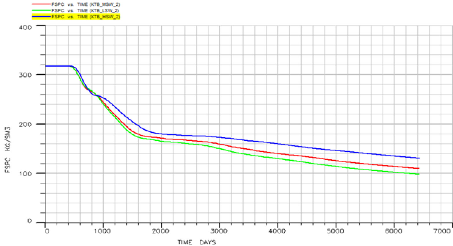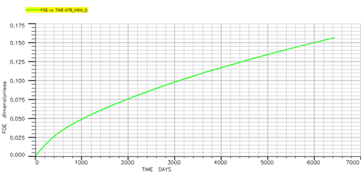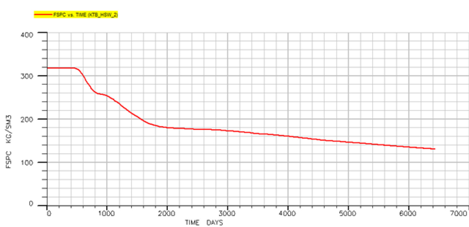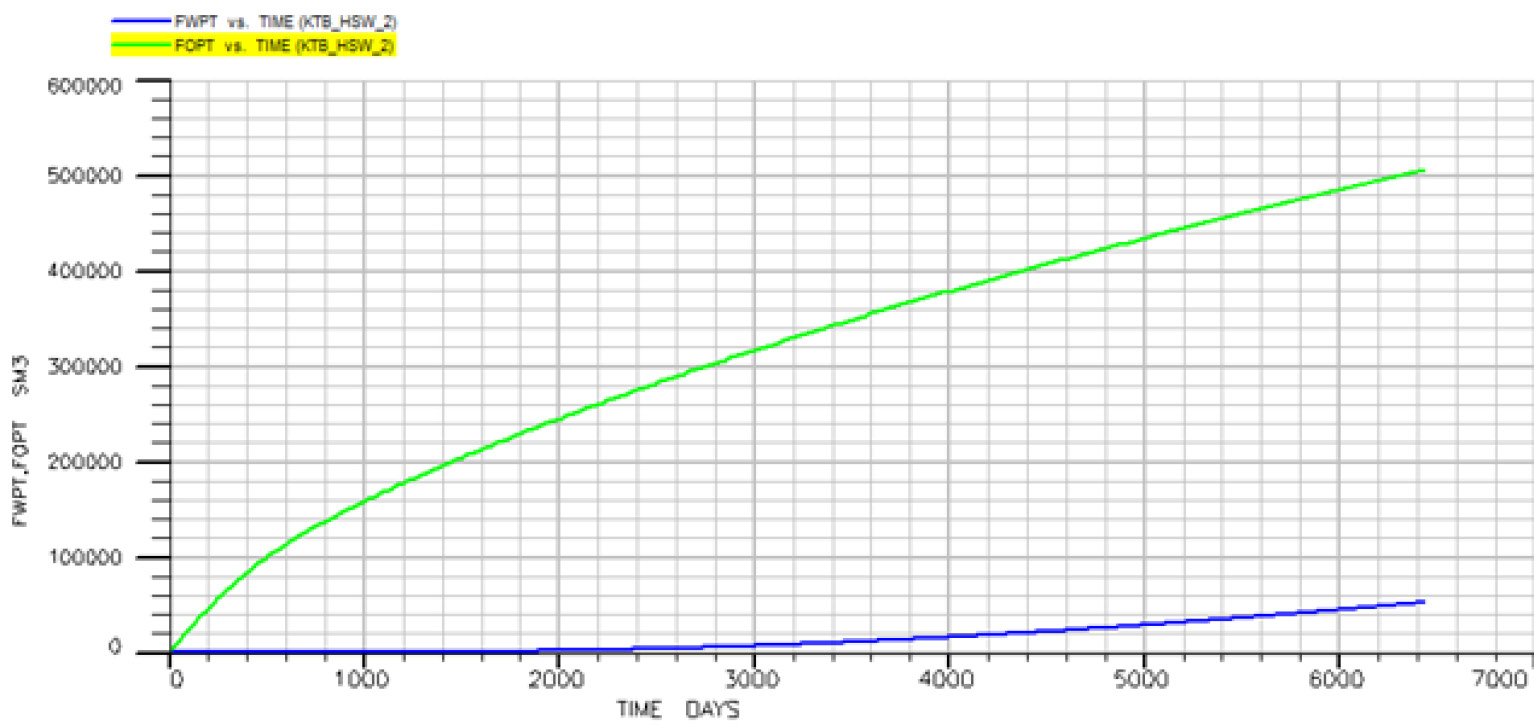 Воздействие концентрации солей на добычу и коэффициент вытеснения нефти на рассматриваемом месторождении во время вторичной закачки было определено путем моделирования заводнения растворов с солёностью в 26,9 кг/м³ (ВС), 13,45 кг/м³ (2dxВС) и 2,69 кг/м³ (10dxВС). Модель была запущена на 18 лет, или примерно 6500 дней. Анализ эффективности понижения солёности был проведен путем сравнения величины нефтедобычи после заводнения с ВС водой.