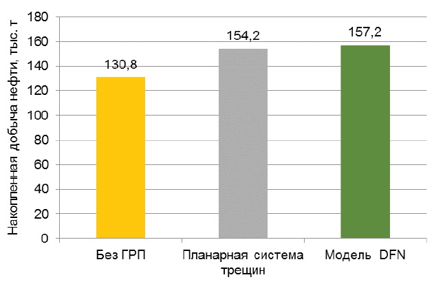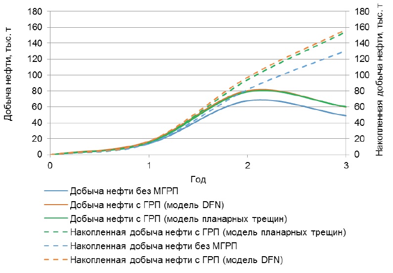 Как видно из рис. 1, уровни добычи нефти при использовании модели планарных систем трещин и модели DFN находятся на сопоставимом уровне.