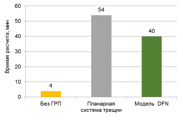 Выполнено моделирование МГРП с использованием двух различных моделей трещин: планарной системы трещин и модели дискретных трещин. Получены сопоставимые уровни добычи. Время расчета также находится на сопоставимом уровне. Преимуществом модели DFN является возможность учета произвольного направления задания трещин по результатам дополнительных специализированных исследований.