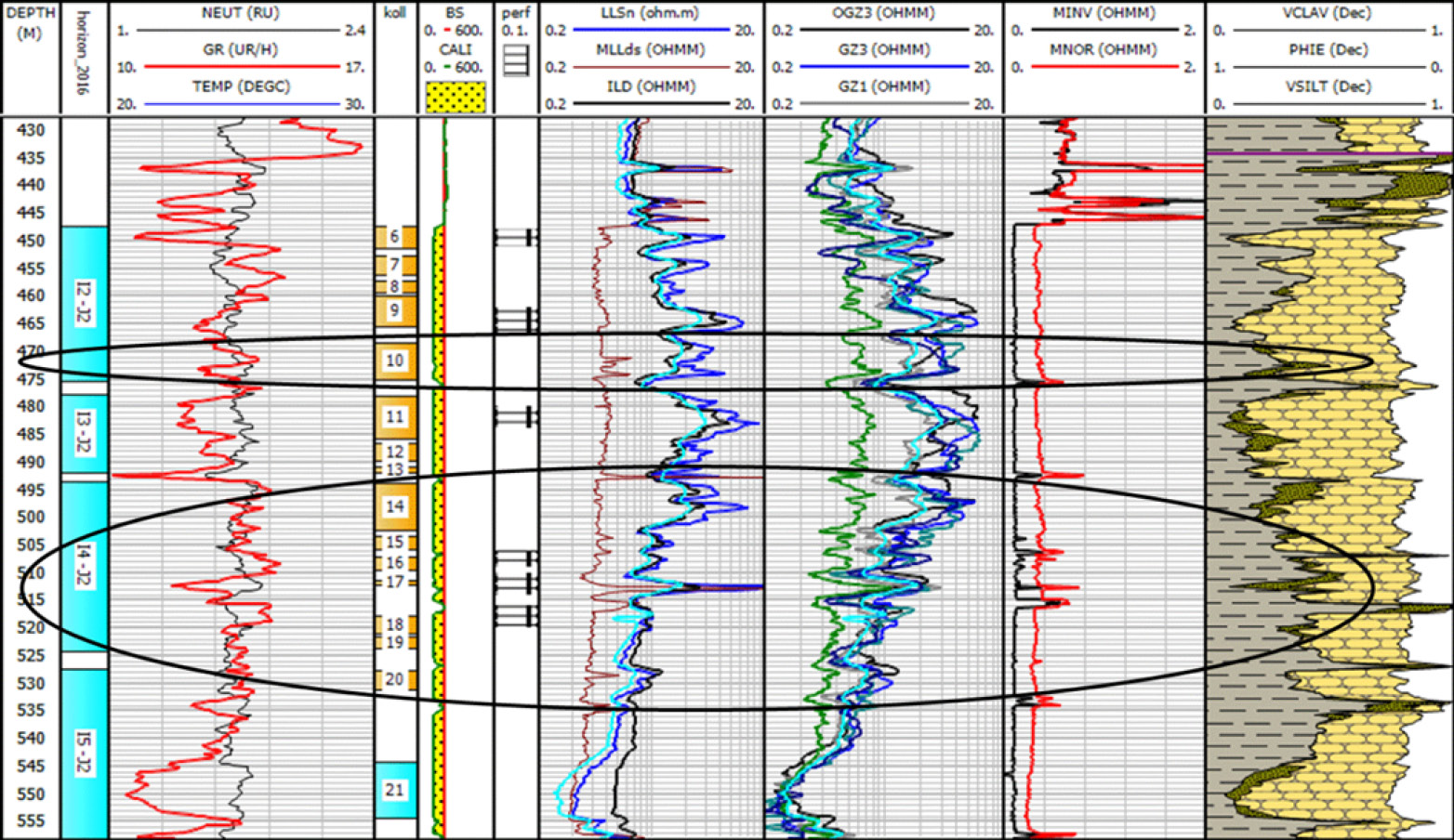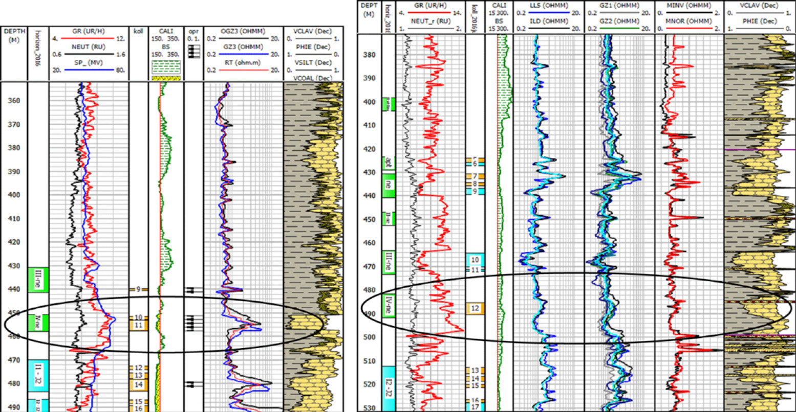 Примеры выделения таких пропущенных коллекторов приведены на рис. 13 и 14, где наглядно показаны две колонки с коллекторами пересчета запасов (далее – ПЗ) за 2013 и 2019 гг. Выделенные в рамках ПЗ за 2019 г. пласты были опробованы, и их продуктивность подтверждена положительными результатами.