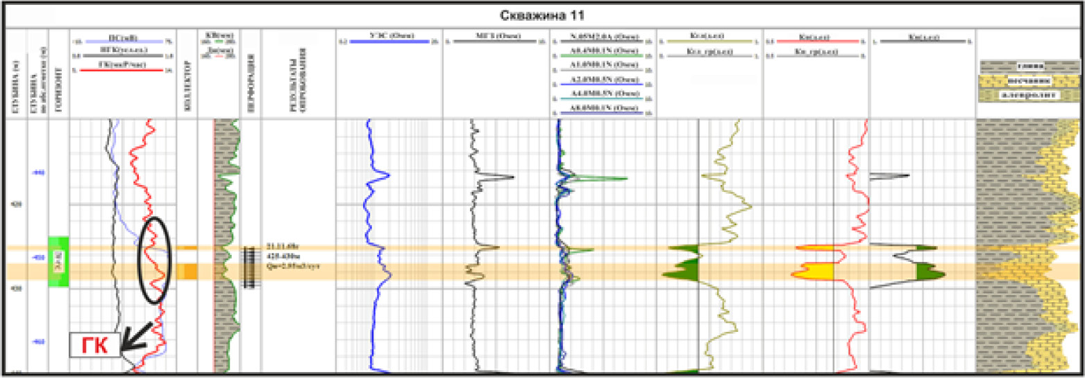 На рис. 3 представлены результаты ГИС разведочной скважины 11 (1968 г.), где в отложениях нижнего мела в неокомском горизонте IV-nc залегает нефтенасыщенный пласт с повышенной радиоактивностью. Пласт опробован, получен приток нефти дебитом 2,95 м³/сут.