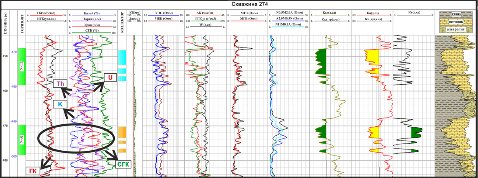 На спектральном каротаже напротив коллекторов отмечается повышенная гамма-активность по ГК при низком содержании K40 и Th232, но высокой концентрации U238.