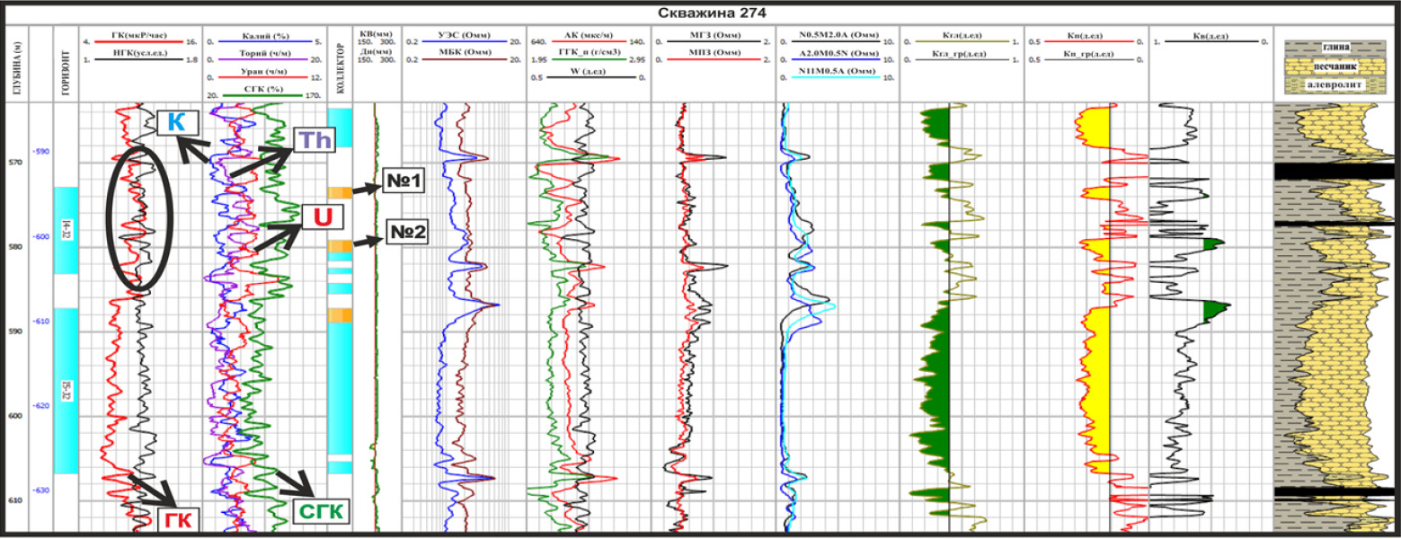 В скважине выполнен полный комплекс ГИС, в том числе и СГК. Верхний нефтенасыщенный коллектор №1 по данным ГК и суммарной радиактивности СГК отмечается максимумом.