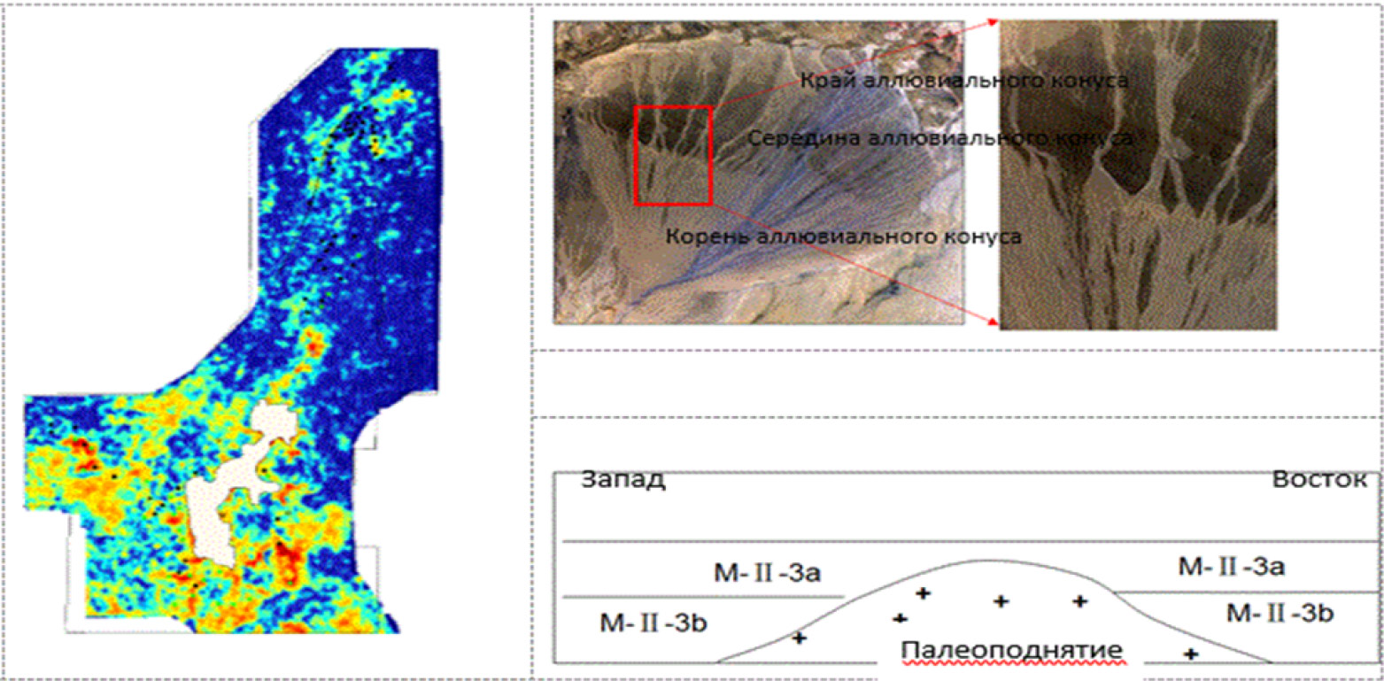 В пласте М-II-3 развит аллювиальный конус юго-западного направления, отложение от середины до края аллювиального конуса. И вокруг высокой точки палеоструктуры Западного Нуралы развиты отложения делювиальной фации. В вертикальном направлении данного пласта развиты тела аллювиального конуса двух периодов М-II-3а, М-II-3b, которые продвигаются от юго-западного направления к северо-восточному и вокруг высокой точки палеоструктуры смешиваются с деллювиальными осадками от высокой точки палеоструктуры (рис. 8).
