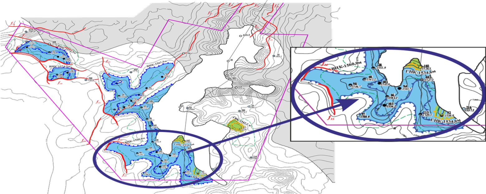 Figure 4. A fragment of the structural map along the top of the IV Neocomian horizon of the South Western Kamyshitovoye field