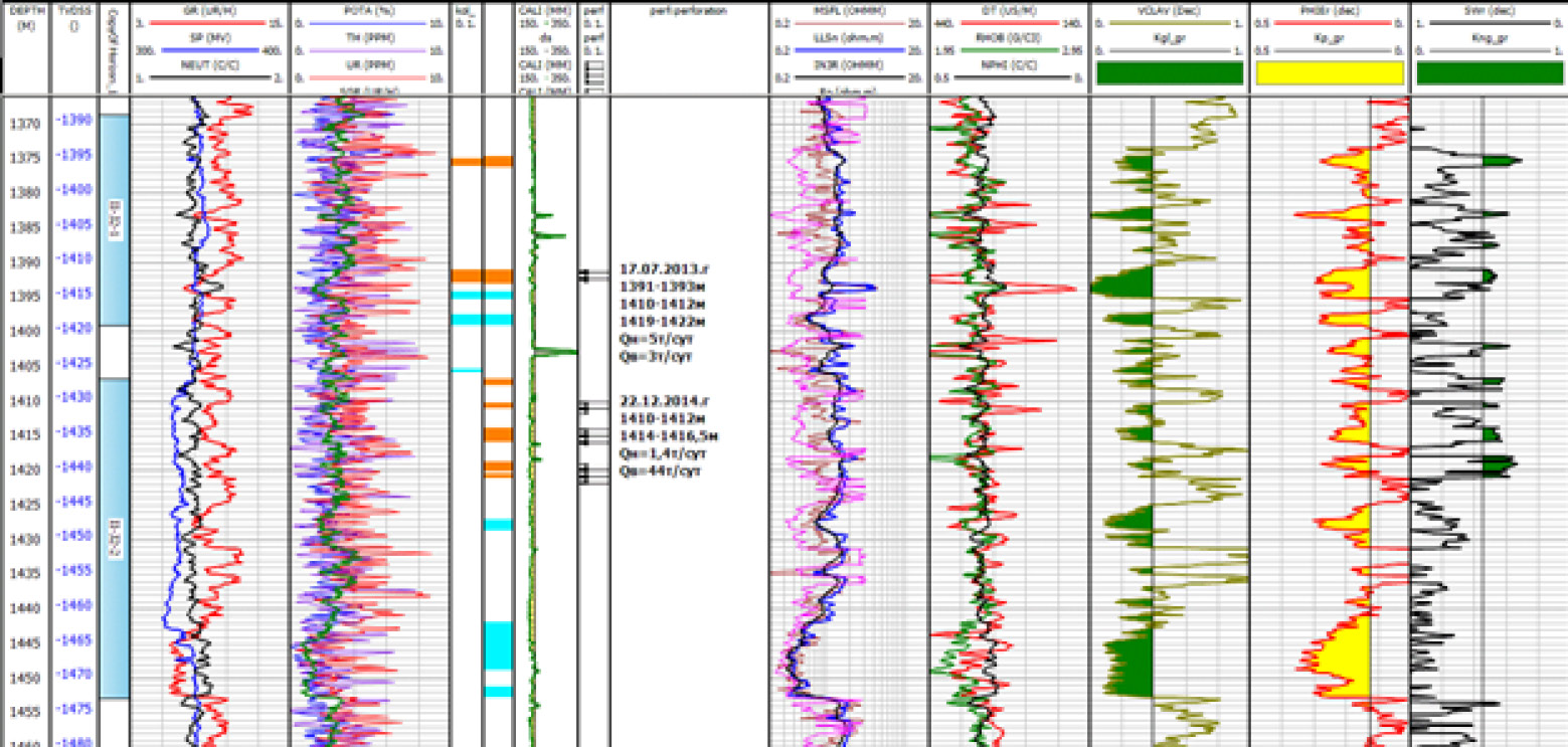 Ранее на данной площади при выполнении работ по оценке запасов фонд скважин состоял в основном из «старых» ГИС с ограниченным комплексом, и рассматриваемые выше пласты с высокой гамма-активностью оставались без внимания. Добавление в комплекс ГИС таких современных методов, как СГК, ГГК, высокочастотный индукционный каротаж изопараметрическое зондирование, привело к надёжному выделению высокорадиактивных коллекторов и позволило уточнить методику интерпретации ГИС «старых» скважин. В результате корреляции и переинтерпретации данных ГИС в «старых» скважинах были добавлены пропущенные пласты-коллекторы.