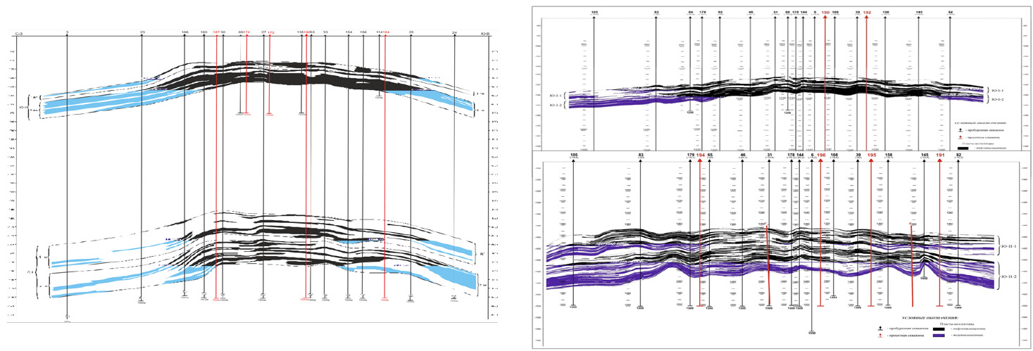 На рис. 15 представлено сравнение геолого-литологических профилей по юрским горизонтам ПЗ за 2013 и 2019 гг., где наглядно видно увеличение эффективных нефтенасыщенных мощностей за счёт добавления пропущенных коллекторов по «старым» скважинам и бурения новых скважин.