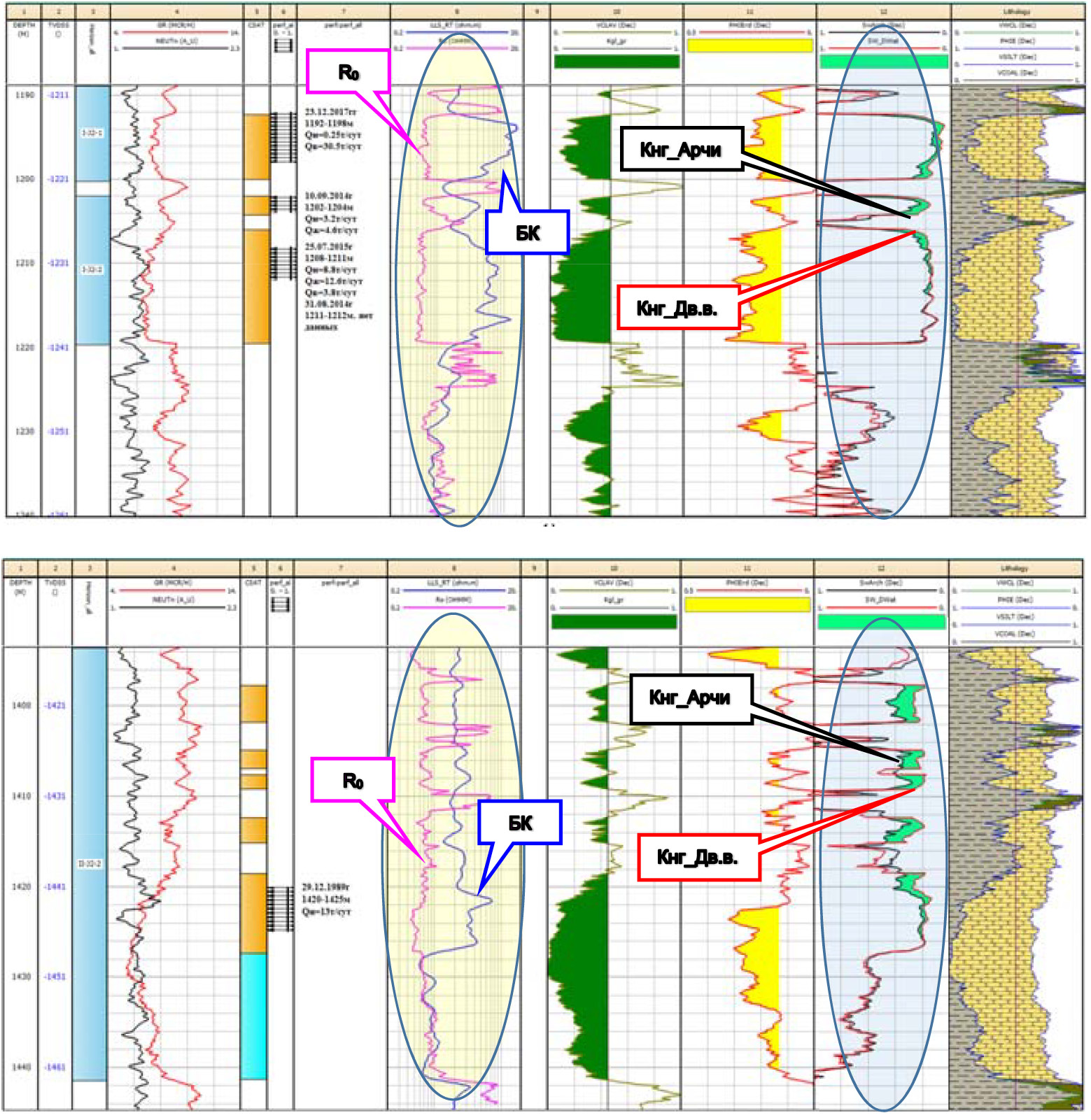 Для подтверждения правильности расчета насыщенности по уравнению «двойной воды» рассчитана кривая Ro, характеризующая сопротивление пласта, содержащего воду. По методическим данным интерпретация считается верной, если при наложении на кривую сопротивления бокового каротажа (далее – БК) при одинаковом масштабировании кривая Ro сходится на глинах и водоносных коллекторах и расходится на нефтенасыщенных.