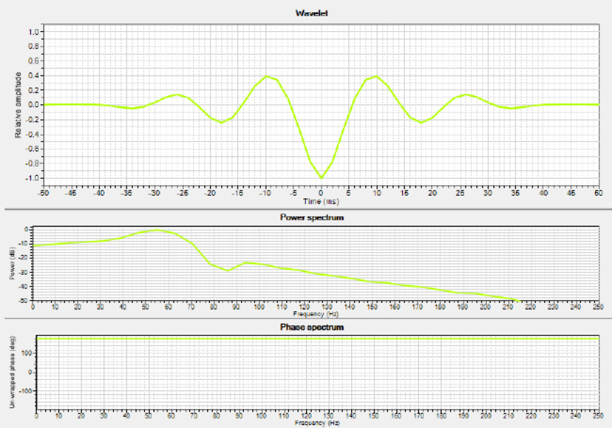 В пределах изучаемой площади имелись всего 2 скв. с данными ВСП, их глубинно-временные зависимости и были взяты за основу при расчете синтетических сейсмограмм. Для скважин были извлечены статистические импульсы. Полученные импульсы имели обратную (европейскую) полярность, где положительному коэффициенту отражения соответствует отрицательный экстремум амплитуды волнового поля (рис. 1).