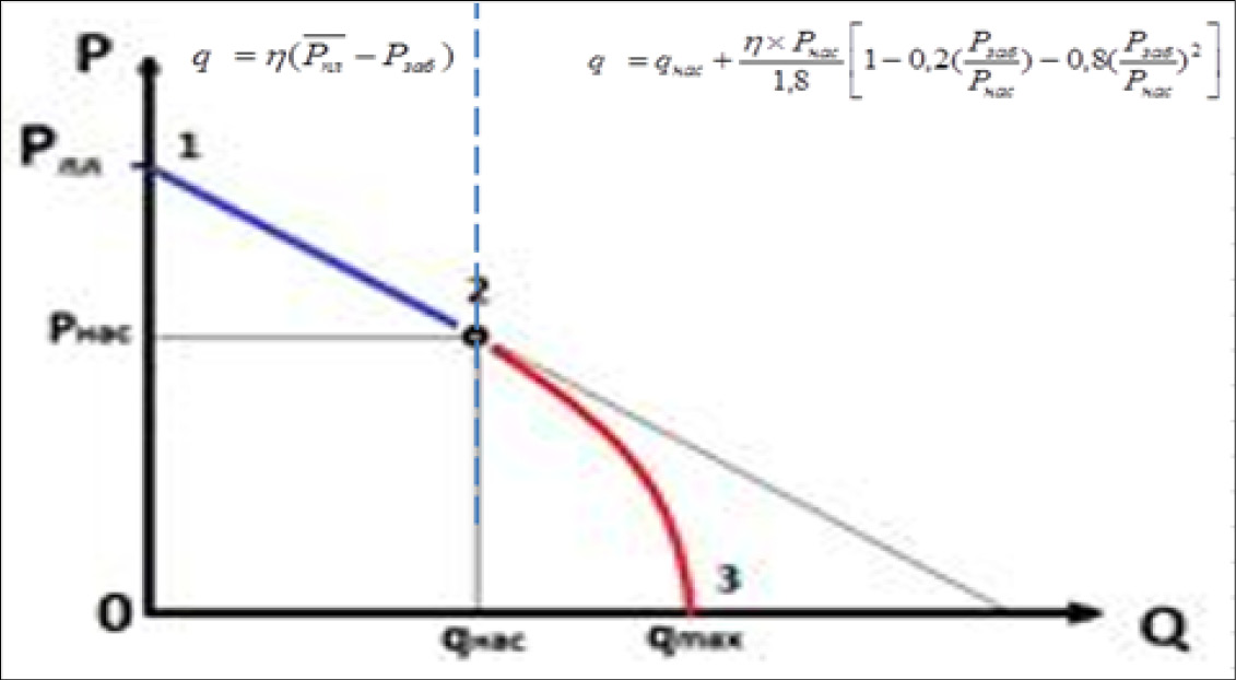 Применяя оба метода, можно получить композитную кривую притока, состоящую из прямолинейного участка (зоны 1–2) и квадратичной зависимости (зона 2–3) (рис. 1).