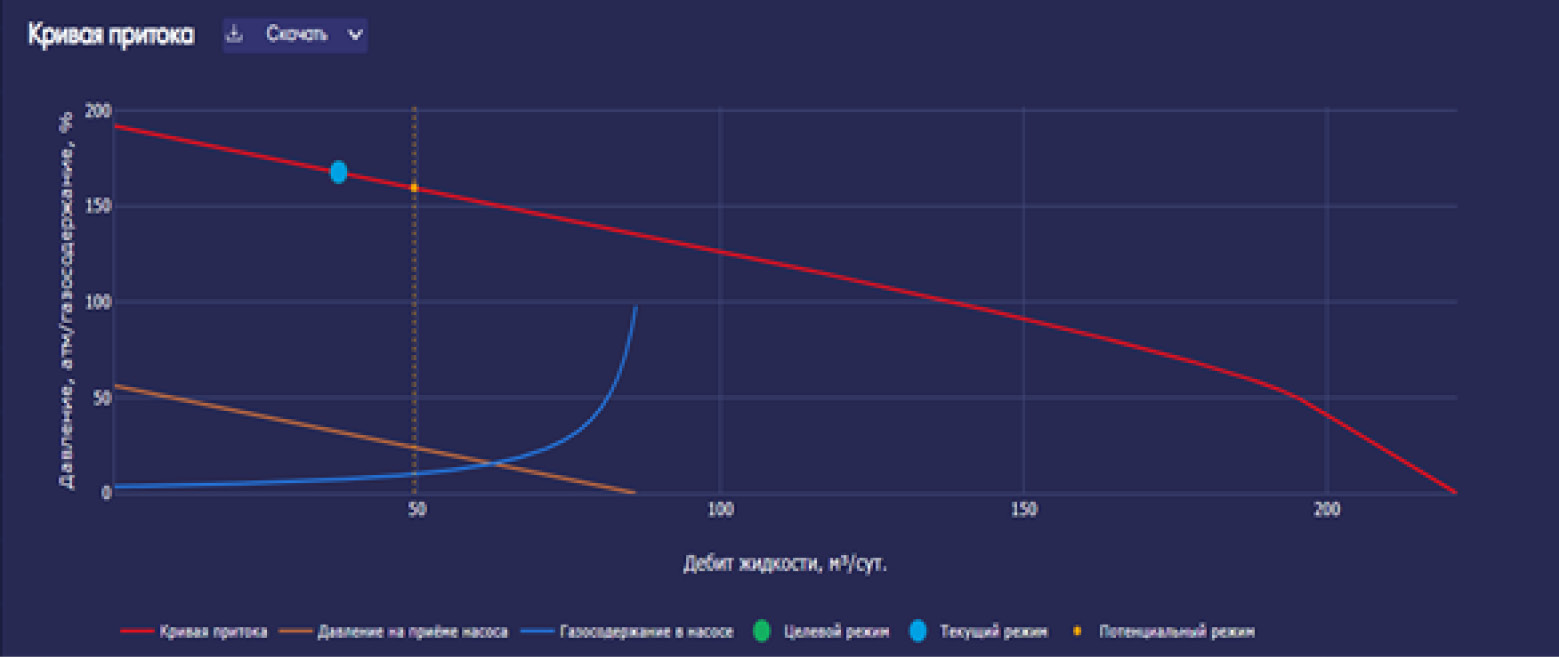 - На основе агрегированных данных технологического режима и баз данных строится модель притока, расчёт потенциала определяется в модуле построением кривых притока, зависимости дебита от давления и газосодержания на приеме насоса (рис. 1).