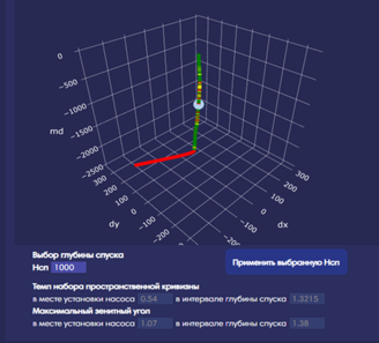 Интересное и удобное в плане визуализации решение для пользователя реализовано в модуле по определению глубины спуска насоса. Глубина спуска насоса не рассчитывается модулем автоматически, но пользователю предлагается определить оптимальную глубину согласно анализу условий на приеме насоса (допустимые значения газосодержания на входе в насос и давления на приеме), а также геометрии ограничений по стволу скважины для эксплуатации насоса (рис. 5). Наиболее надежным является спуск компоновки с минимальным количеством интервалов потенциального риска истирания штанг и колонны насосно-компрессорных труб (далее – НКТ), либо необходимо установить в критичные интервалы центраторы штанг. Мониторинг ограничений по стволу скважины осуществлен в модуле через вызов окна 3D-профиля ствола скважины, построенного на основе координат инклинометрии X, Y, Z и таблицы основных параметров (замеренная глубина (MD), истинная глубина (TVD), удлинения, зенитного и азимутального углов, темп набора пространственной кривизны (DLS).