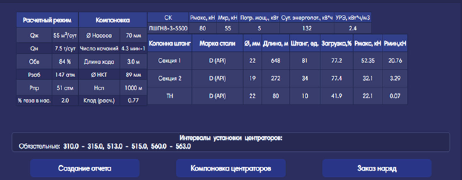 После выполнения всей процедуры, в отчете модуля выводятся следующие результаты расчётов (рис. 7): ожидаемый технологический режим, тип и режим работы СК, коэффициент подачи, давление и газосодержание на приеме насоса, информация по колонне штанг с разбивкой по ступеням, минимальными и максимальными нагрузками на каждую ступень, энергопотребление и другое.