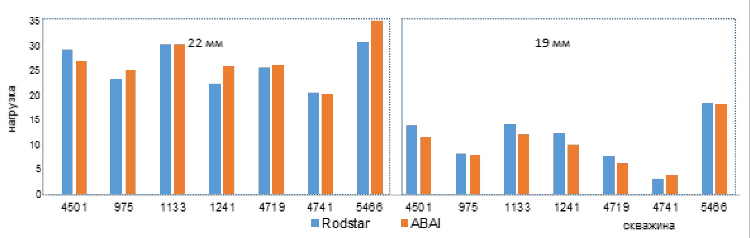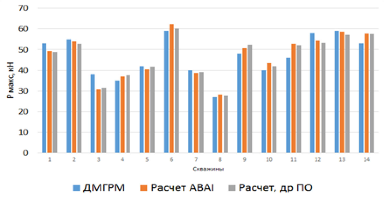 Аналогичные исследования проводились по сравнению результатов расчёта нагрузок в другом лицензированном ПО. Получены не менее надёжные результаты сравнения. Нагрузки на колонну штанг Рмакc, Рмин показали хорошую сходимость по нагрузкам секций: среднее отклонение по максимальной нагрузке – 3,1%, по минимальной загрузке – 5,7% (рис. 10, 11).