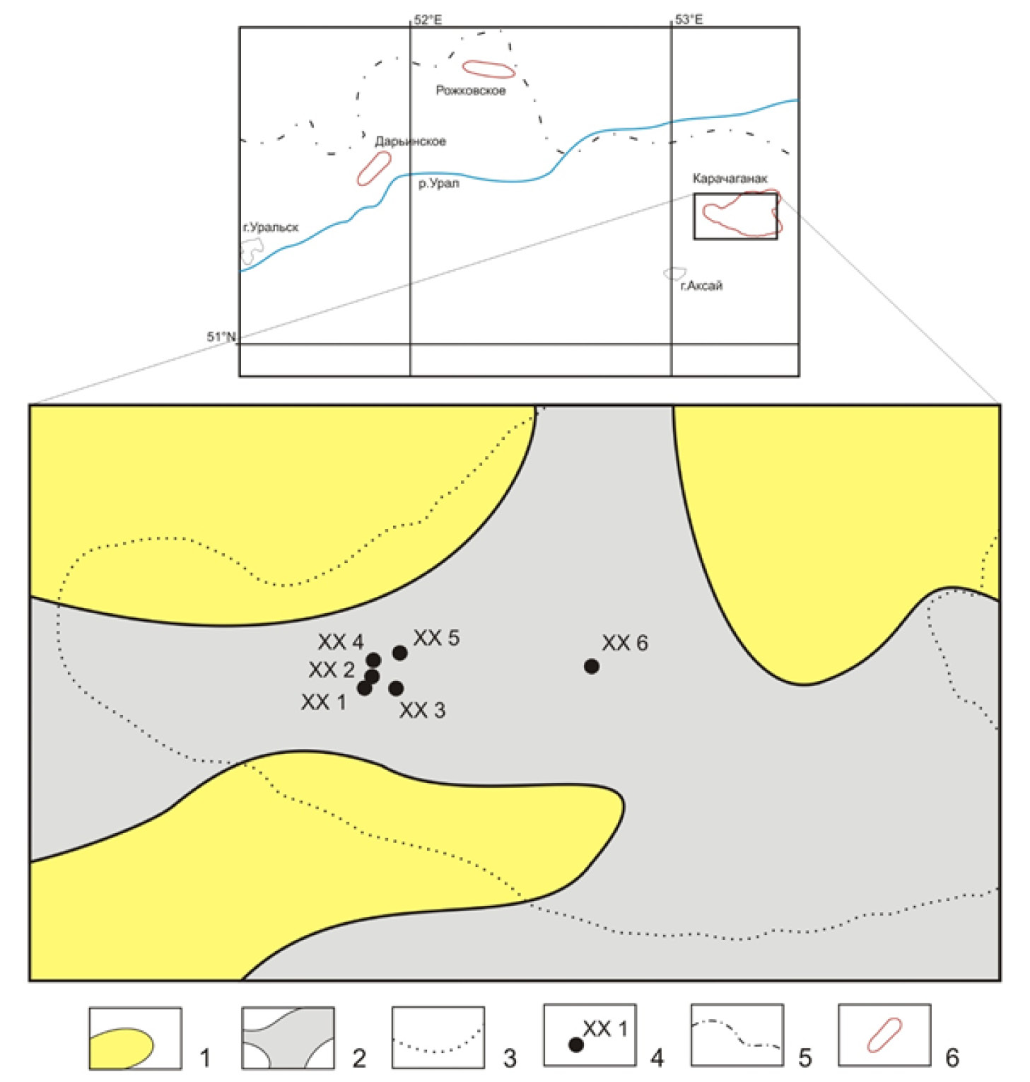 В ходе выполнения проекта по изучению керна триасовых и татарского горизонтов месторождения Карачаганак использовался керновый материал пяти скважин №№ XX-2, XX-3, XX-4, XX-5, XX-6 (рис. 1.) общей длиной 330 м, шлам одной из этих скважин, XX-4, а также результаты предыдущих исследований по скв. XX-1. При литологическом описании кернового материала был проведен поиск под бинокуляром фаунистических остатков по плоскостям напластования пород. При осмотре керна из трёх скважин были найдены и определены единичные раковины конхострак. Также при осмотре керна скв. XX-5 в интервале 742,17–742,25 м была найдена верхнечелюстная кость раннего архозавра светло-серого цвета. Для определения возраста по остракодам были отобраны благоприятные для них глинистые породы в количестве 44 образцов, из которых в 11 образцах были найдены комплексы остракод. Также для полного освещения разреза был изучен шлам скв. XX-4 в количестве 257 проб шлама (интервал 300–2640 м).