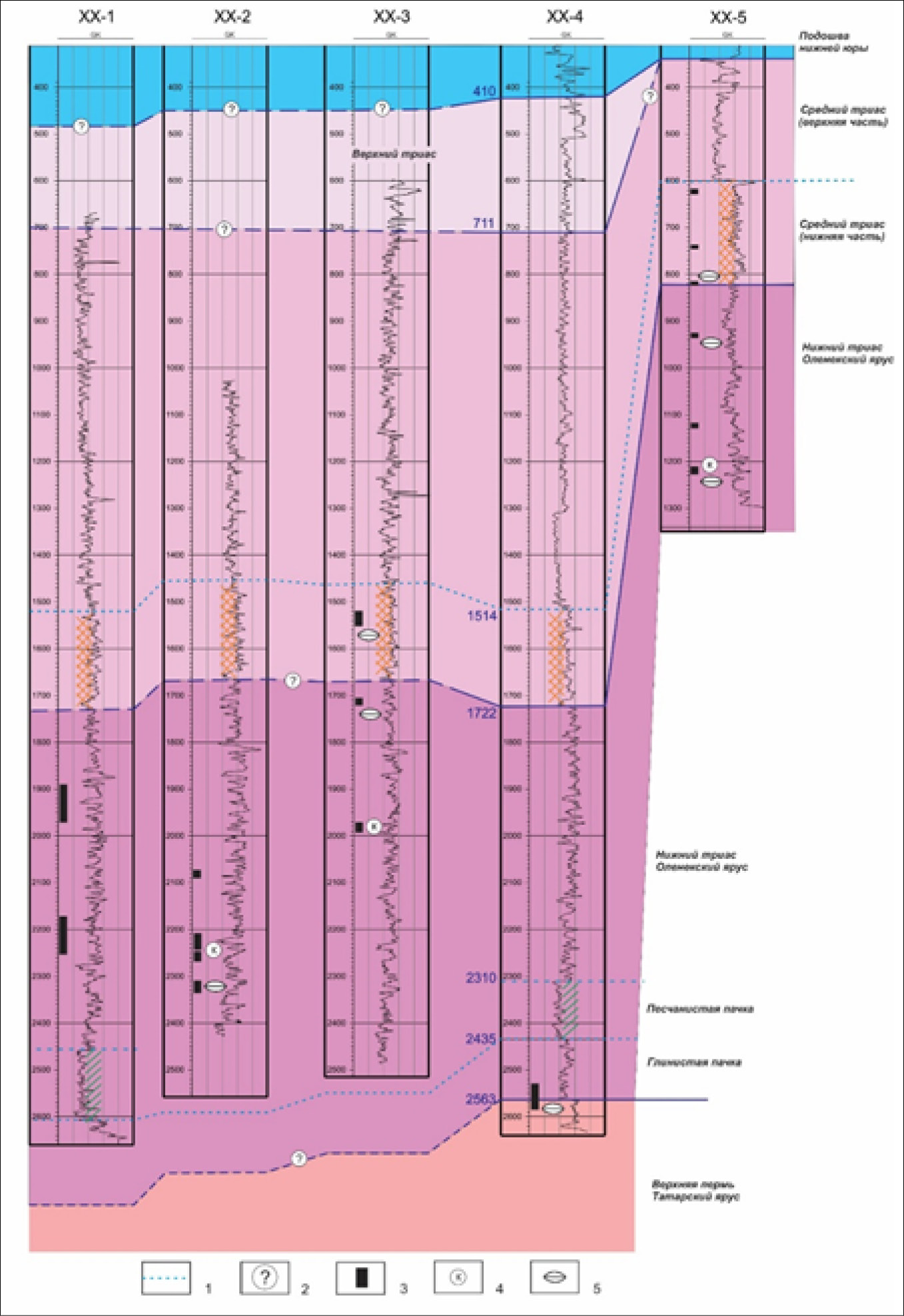 Полная толщина среднего триаса в скв. XX-4 составляет 1011 м, и можно уверенно утверждать, что толщины такого порядка вскрыты скв. XX-1, XX-2 и XX-3 (рис. 2). В нижней части разреза среднего триаса скв. XX-4 по каротажным данным можно выделить глинистую пачку, которая также выделяется в разрезе среднего триаса скв. XX-1, XX-2, XX-3. Среднетриасовые отложения в скв. XX-5 вскрыты в интервале 340–820 м, предлагается отнести к среднему триасу всю толщу триаса до юрских отложений, т.к. по данным сторонней сервисной компании, в шламе из глубины 480 м встречены остракоды, что косвенно указывает на среднетриасовый возраст этой же глубины. В нижней части разреза среднего триаса скв. XX-5 по каротажным данным также выделяется глинистая пачка, что указывает на хорошую корреляцию низов среднего триаса в районе месторождения Карачаганак. Таким образом, на фоне выдержанного по толщине около 1000 м разреза среднего триаса большинства скважин, в скв. XX-5 толщина среднего триаса составляет около 480 м. Такое сокращение толщины связано с отсутствием верхней части среднего триаса, что связано с ростом соляного купола и выводом на дневную поверхность верхней части среднего триаса и её последующего размыва. Можно предположить, что в участках, ещё приближенных к соляному куполу, отложения среднего триаса будут полностью размыты и частичному размыву будут подвержены нижнетриасовые отложения.