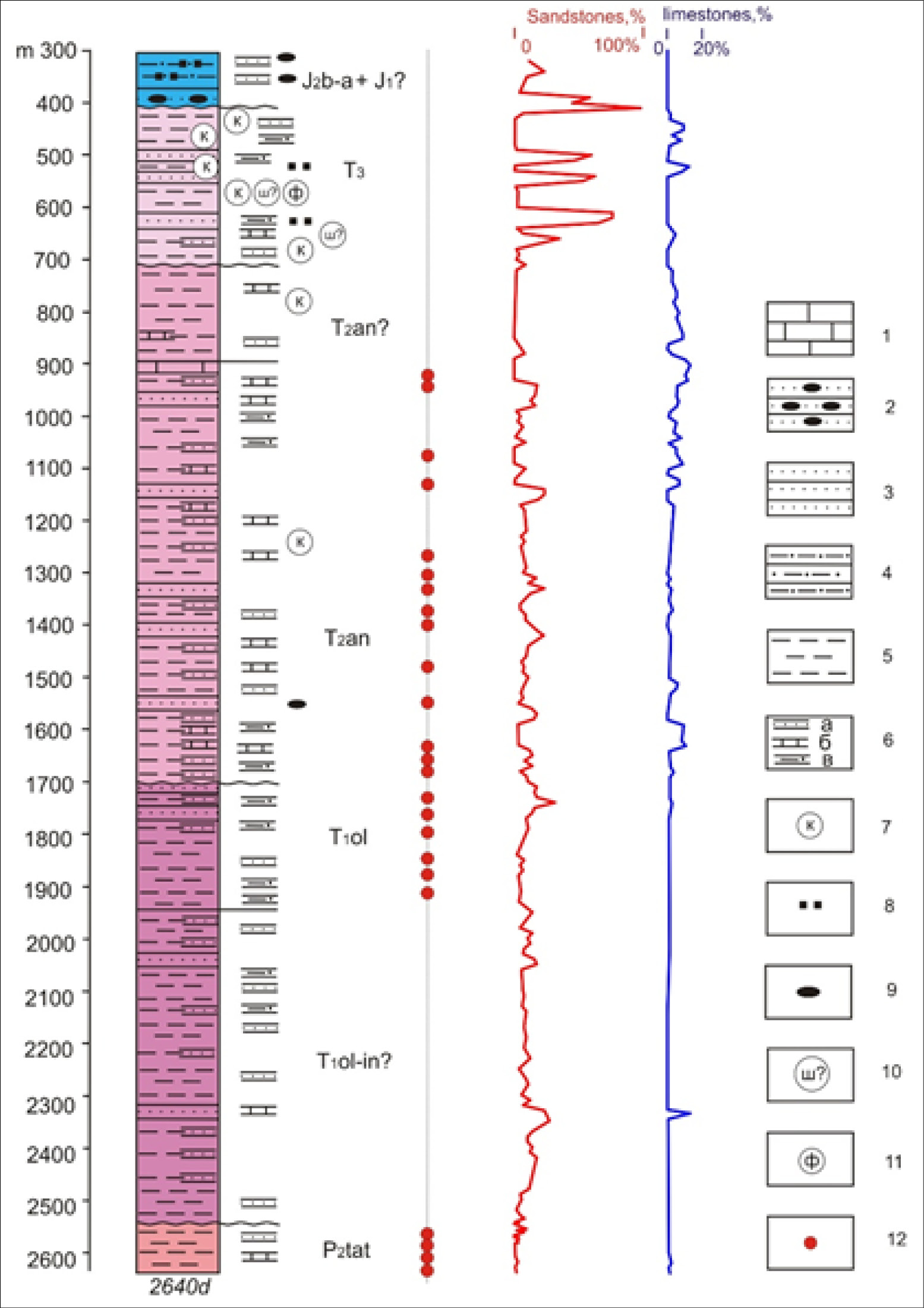 Триасовые отложения месторождения Карачаганак освещены керном неравномерно (рис. 2), керн отобран в основном из нижней части разреза, а верхняя часть разреза охарактеризована единичными выносами керна (из-за отсутствия каротажа скв. XX-6 разрез этой скважины в схеме не приведен), поэтому литологическая характеристика интервалов разреза, в которых керн не отобран, приведена по данным изучения шлама разреза скв. XX-4. В этой скважине по литологическим и биостратиграфическим данным, полученным в результате изучения шлама скважины (рис. 3), выделены верхнепермские и триасовые отложения.