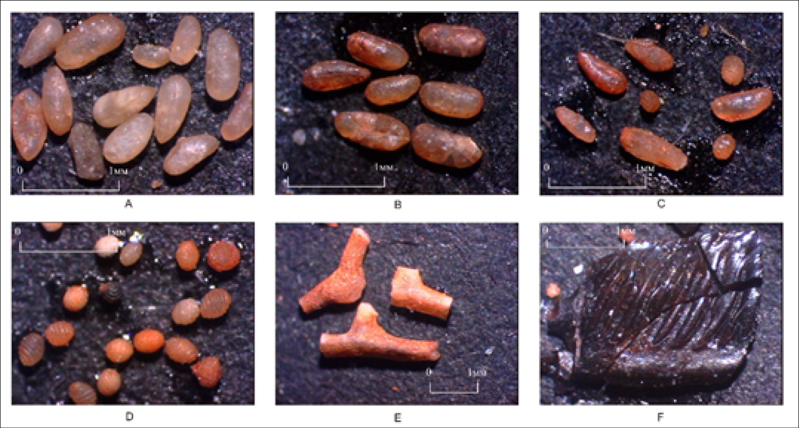 Рисунок 4. Фаунистические остатки, характеризующие отложения верхней перми и нижнего триаса скважин месторождения Карачаганак. А) Комплекс остракод татарского яруса верхней перми. Скв. XX-4, керн, интервал 2564,50–2564,55 м; B) Комплекс остракод татарского яруса верхней перми. Скв. XX-4, шлам, интервал 2600–2630 м; C) Комплекс остракод оленёкского яруса, нижнего триаса. Скв. XX-2, керн, интервал 2316,70–2316,75 м; D) Комплекс харовых водорослей (харофитов) нижний триас, оленёкский ярус. Скв. XX-3, керн, интервал 1718,30–1718,35 м; E) Известковистые водоросли неясной систематики в виде трубчатых образований, нижний триас, оленёкский ярус. Скв. XX-5, керн, интервал 1219,30–1219,35 м; F) Рыбные остатки в виде чешуй коричневого цвета, нижний триас, оленёкский ярус. Скв. XX-5, керн, интервал 933,10–933,15 м.
