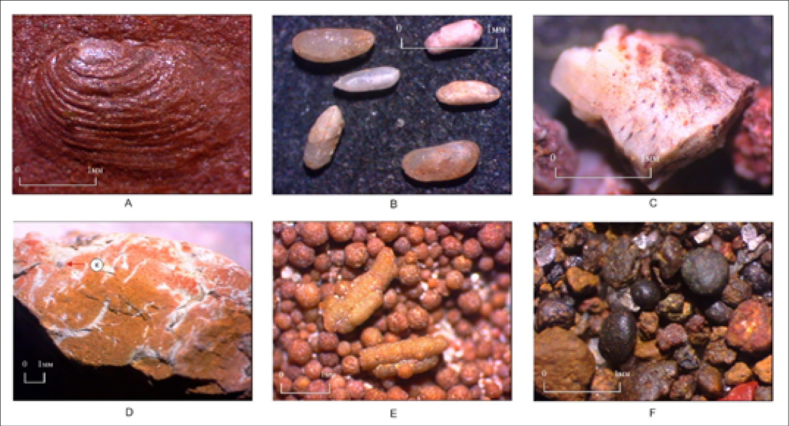 Рисунок 5. Фаунистические остатки и минеральные скопления, характеризующие отложения нижнего, среднего и верхнего триаса скважин месторождения Карачаганак. А) Раковины конхострак вида Pseudestheria longa Nov., нижний триас, оленёкский ярус. Скв. XX-2, керн, интервал 2243,45–2243,50 м; B) Комплекс остракод анизийского яруса среднего триаса. Скв. XX-5, керн, интервал 825,28–825,33 м; C) Фосфатные остатки светло-серого цвета со сложным сетчатым строением, средний триас, анизийский ярус. Скв. XX-5, керн, интервал 820,50–820,55 м; D) Глина светло-коричневая с серыми пятнами, с зернами кальцита округлой формы (к), верхний триас. Скв. XX-4, шлам, интервал 680 м; E) Зерна кальцита округлой формы, участками их сростки, верхний триас. Скв. XX-4, шлам, глубина 520 м; F) Зерна фосфоритов темно-коричневого цвета, округлой формы, верхний триас. Скв. XX-4, шлам, глубина 580 м