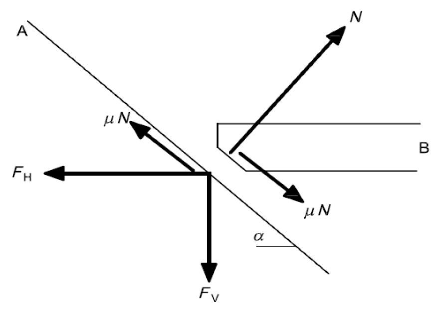 A – наклонная грань конструкции / inclined face of the structure; α – угол наклона грани конструкции от горизонтали, радиан / inclination angle of the structure face from horizontal, a radian; B – наступающий ледяной блок / approaching ice block; FH – горизонтальная составляющая ледового воздействия, Н / horizontal component of ice load, N; N – нормальная составляющая реакции на воздействие льда на конструкцию, Н / normal component of the reaction to ice action on the structure, N; FV – вертикальная составляющая воздействия льда, Н / vertical component of ice action, N; μ – коэффициент трения ледяной конструкции / coefficient of friction of the ice–structure interface