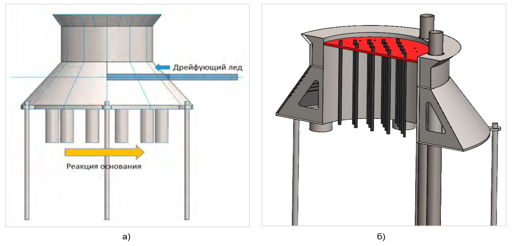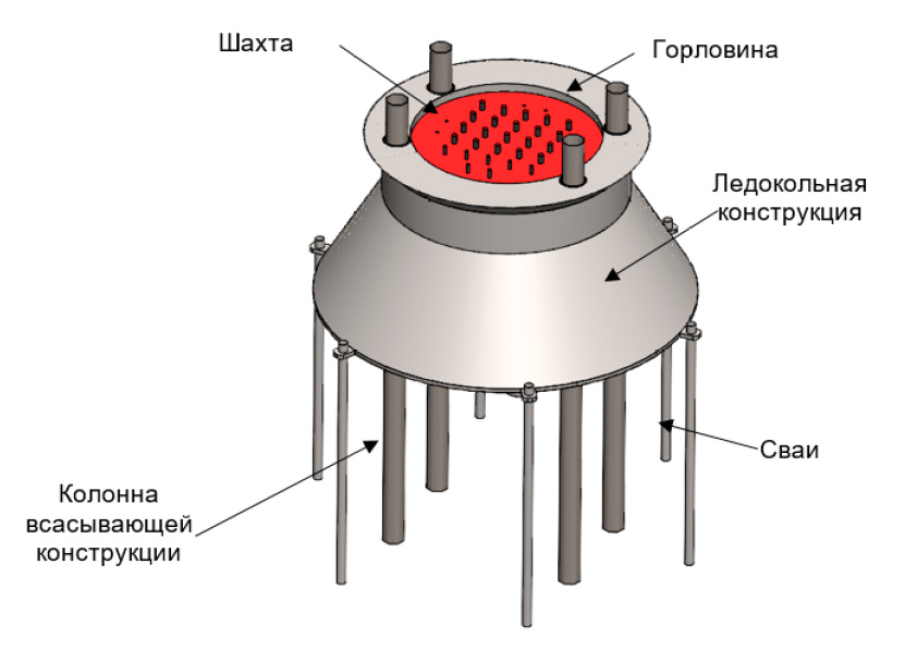 - Детали конструкции. Всасывающее основание и сваи являются основой предлагаемой системы. Эти элементы обеспечивают уникальные характеристики платформы и её способность эффективно справляться с воздействием ледяных условий.