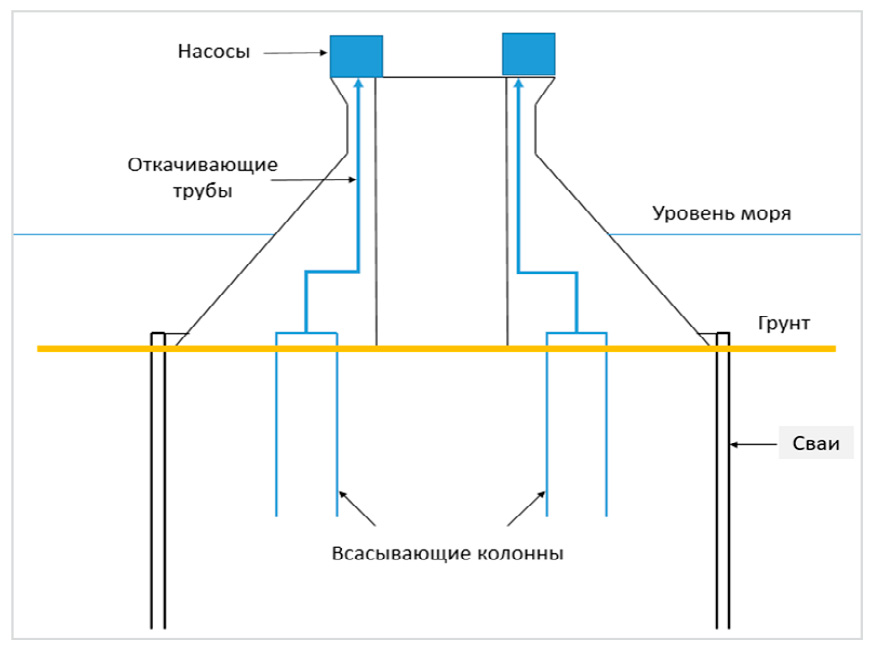 - Применение всасывающих свай наряду с обычными. Это инновационное решение способствует обеспечению более крепкой устойчивости платформы к различным нагрузкам, таким как статические нагрузки от ледяных глыб, динамические ледовые воздействия, волновые нагрузки и другие воздействия.
