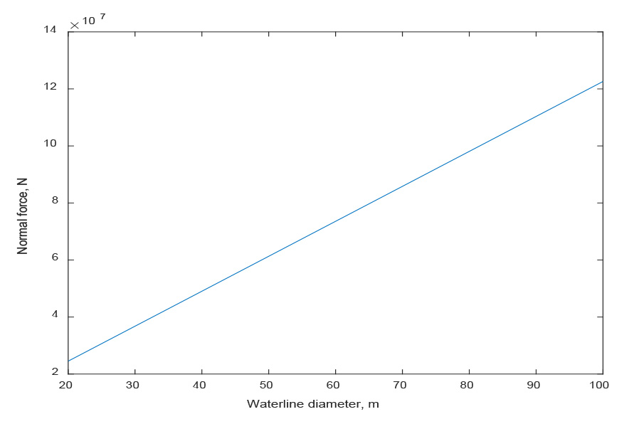 Данный результат был рассчитан при значениях 48,3737° и 5 м. Поскольку существует линейная зависимость между силой и диаметром ватерлинии, очевидно, что минимальный диаметр ватерлинии приводит к минимальной силе.